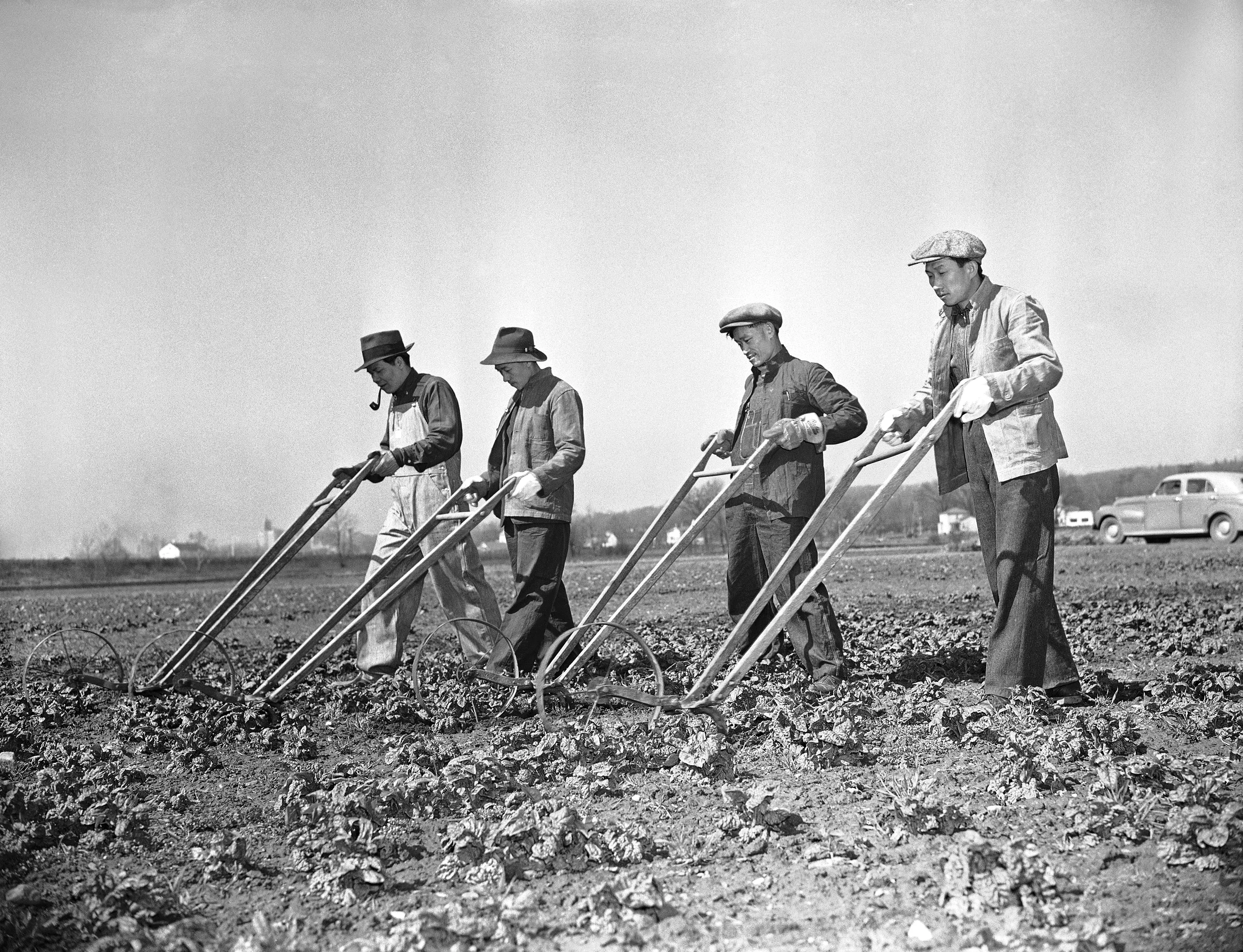 Four Chinese New Yorkers, answering the call for laborers to produce food required by the war effort, cultivate spinach on a farm near Albany, N.Y., May 6, 1943. Left to right: Hon Ying, Chen Ah Sue, Sing Ah Jang, and Wong Ah Sei. All were farmers in their native land. (Photo by AP Photo)