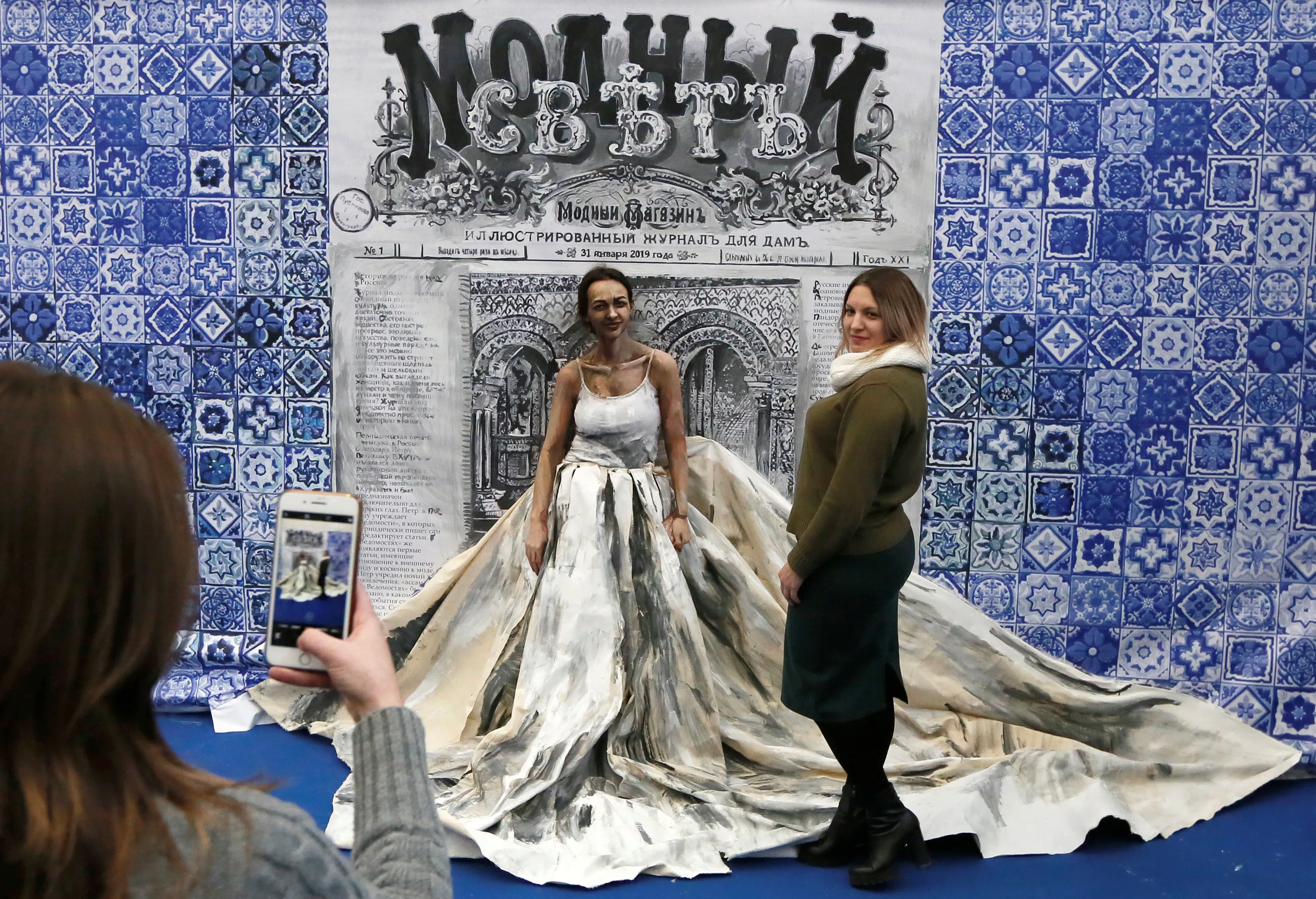 A visitor poses for a picture with Russian artist Maria Gasanova, who presents a body art creation, part of her “Alive Painting” project, during a fashion exhibition in the Siberian city of Krasnoyarsk, Russia on January 31, 2019. (Photo by Ilya Naymushin/Reuters)