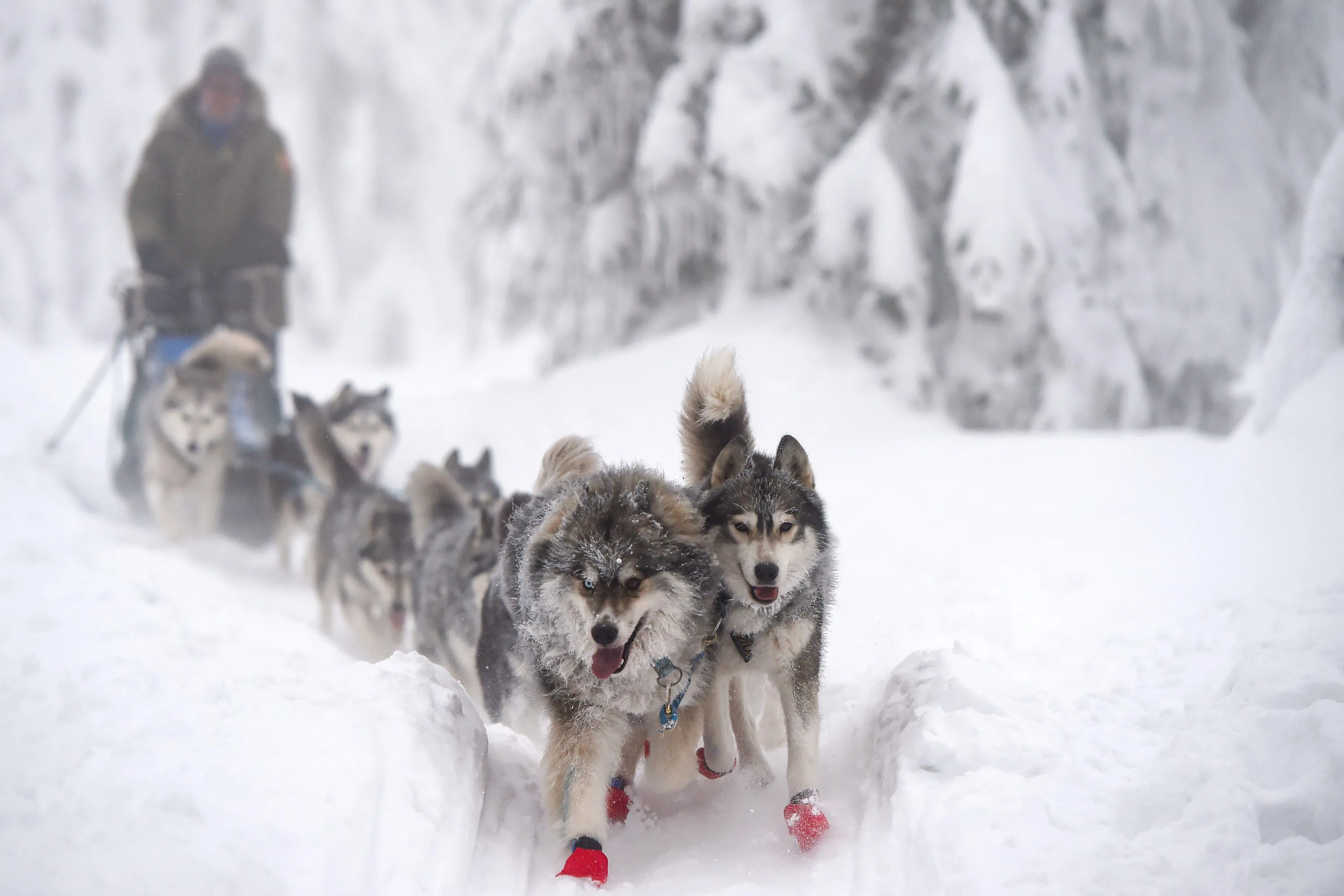 A competitor rides his dog sled during the Sedivackuv Long race on 25 January 2019, in Destne village, in the Orlicke mountains in Czech Republic. Only half of the hundred mushers who braved one of Europe's toughest sled dog races, the Czech Long Trail, finished the competition which ended on January 26, 2019. (Photo by Michal Cizek/AFP Photo)