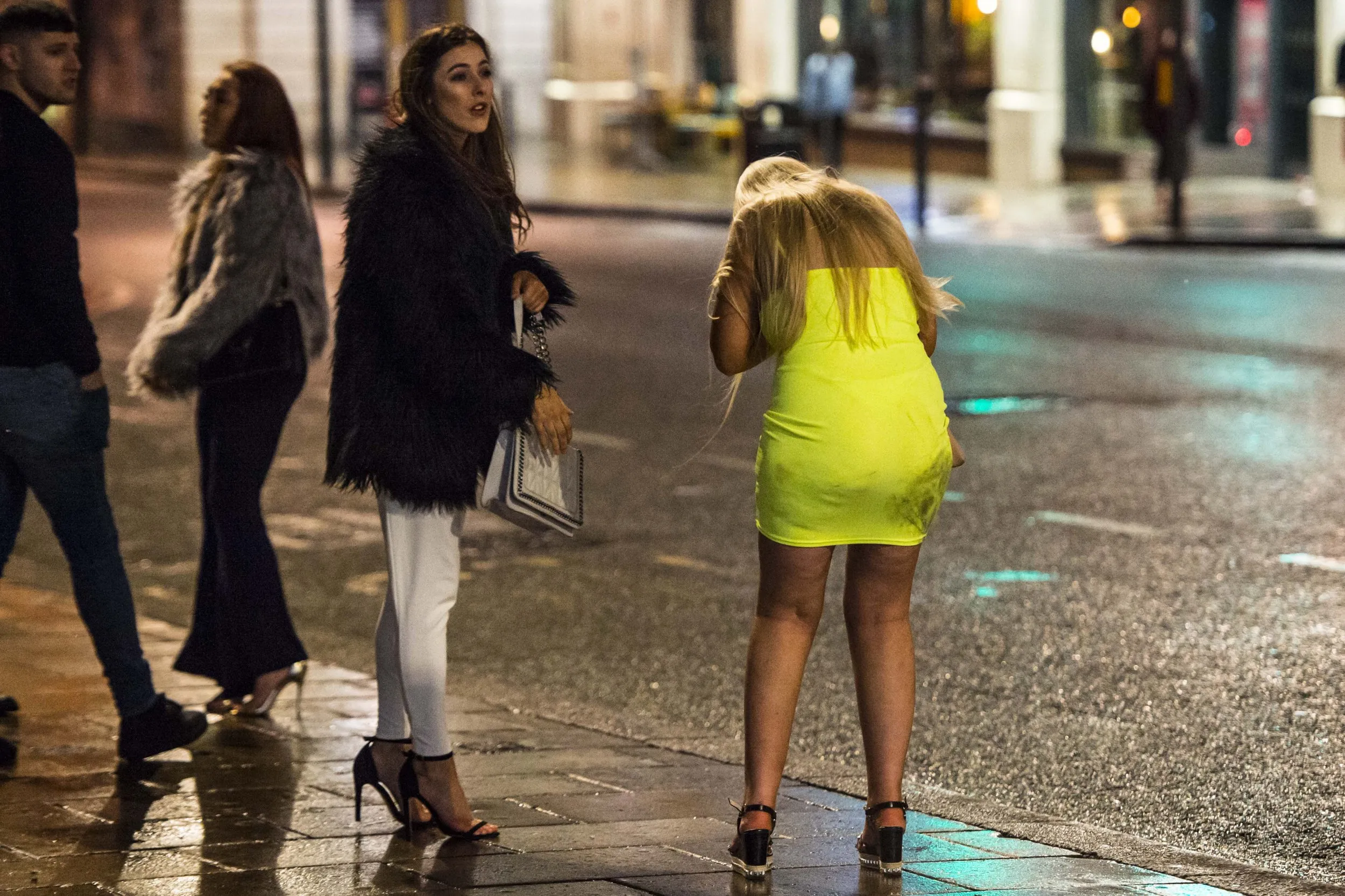 A girl bends over as she heaves in a dirty yellow dress in Leeds city centre last night (FRI) as the country heads back on the booze after completing “Dry January”, a challenge to not drink throughout the month of January on February 2, 2019. (Photo by South West News Service)