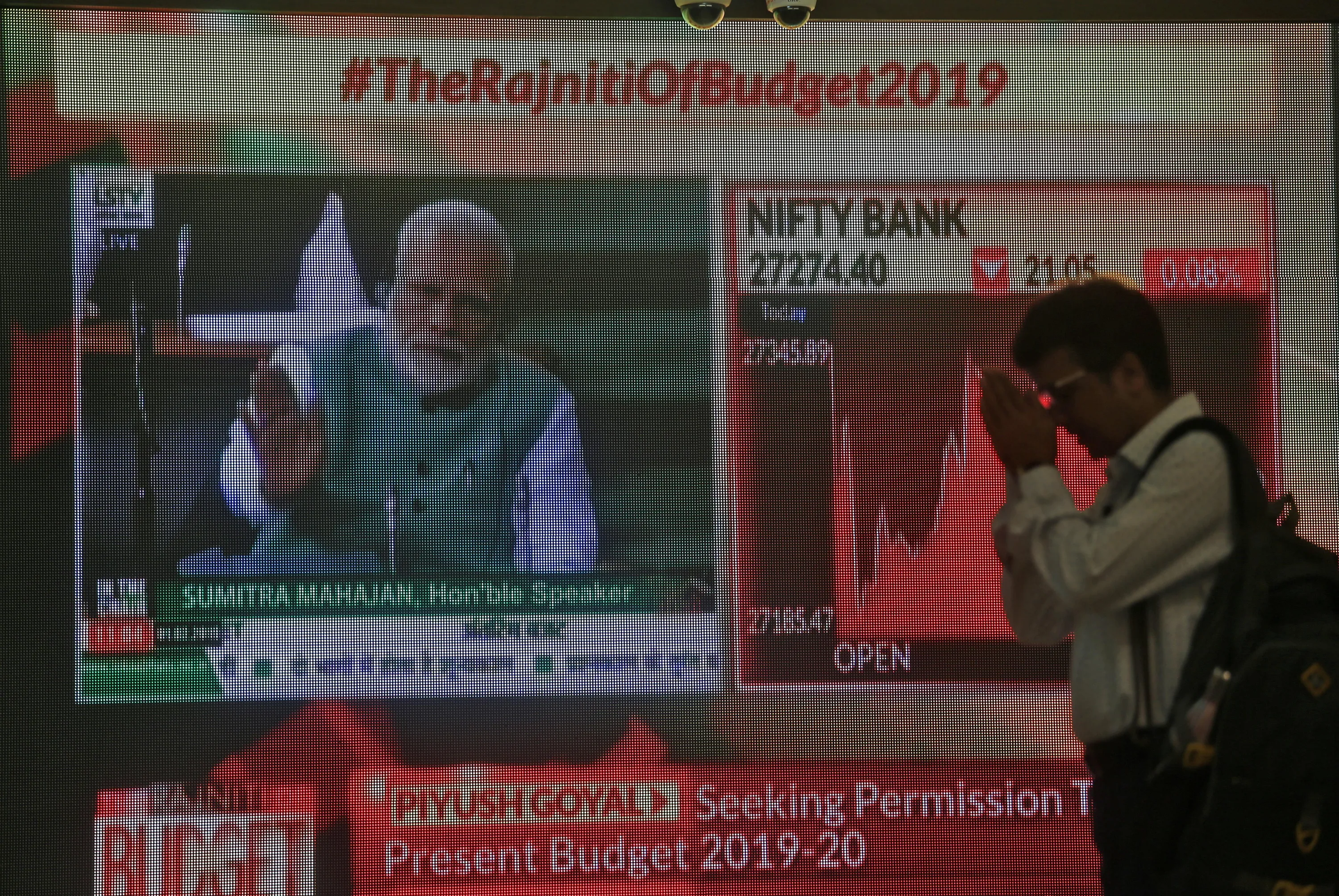 A man prays next to a screen telecasting India's interim budget, inside the Bombay Stock Exchange (BSE) building in Mumbai, India, February 1, 2019. (Photo by Francis Mascarenhas/Reuters)
