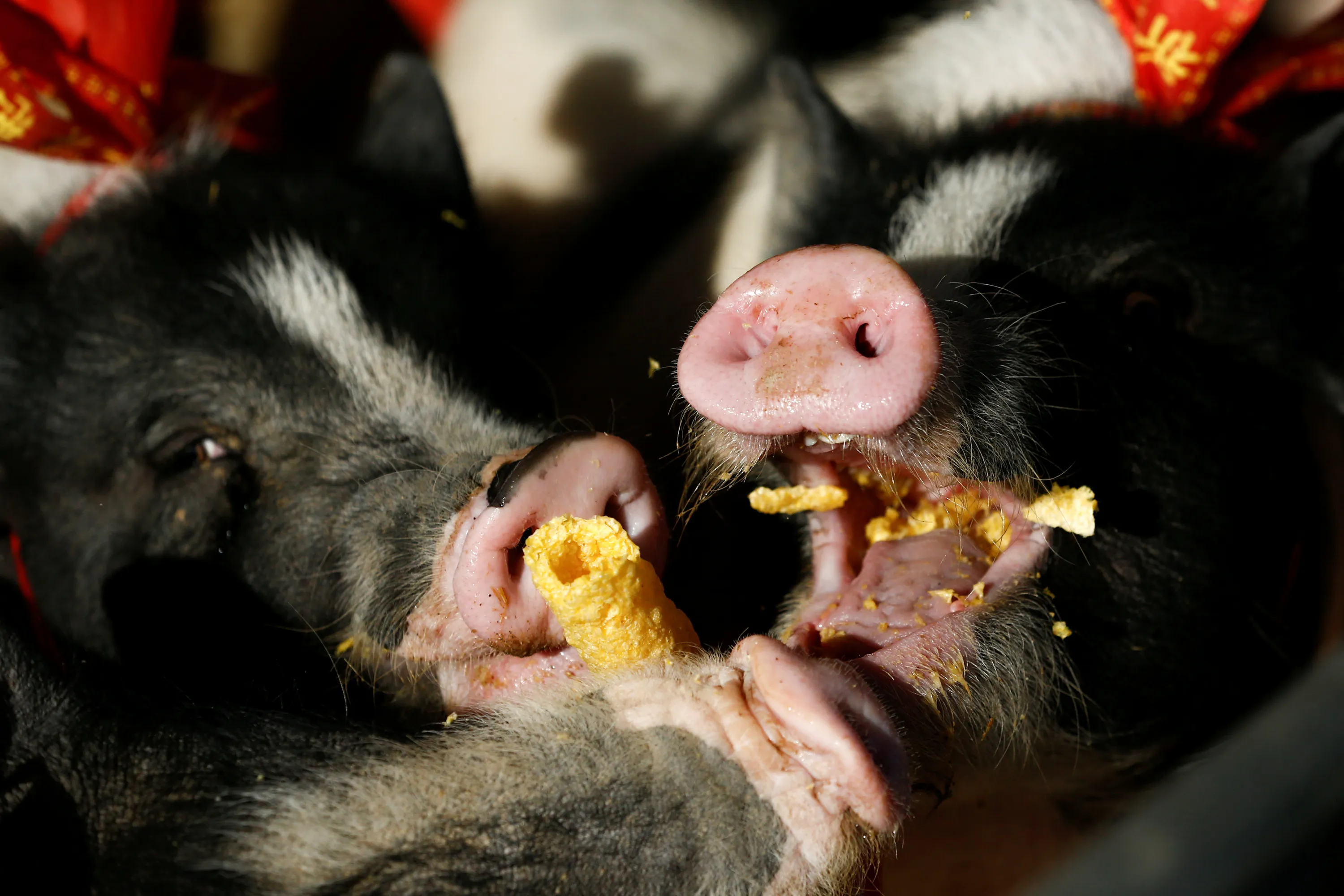 Pigs fed on dried corn sticks after running through an obstacle course at the Green Island Holiday Farm as part of an attraction marking the upcoming Lunar New Year of the Pig in Zhangjiakou, Hebei Province, China on January 27, 2019. (Photo by Thomas Peter/Reuters)
