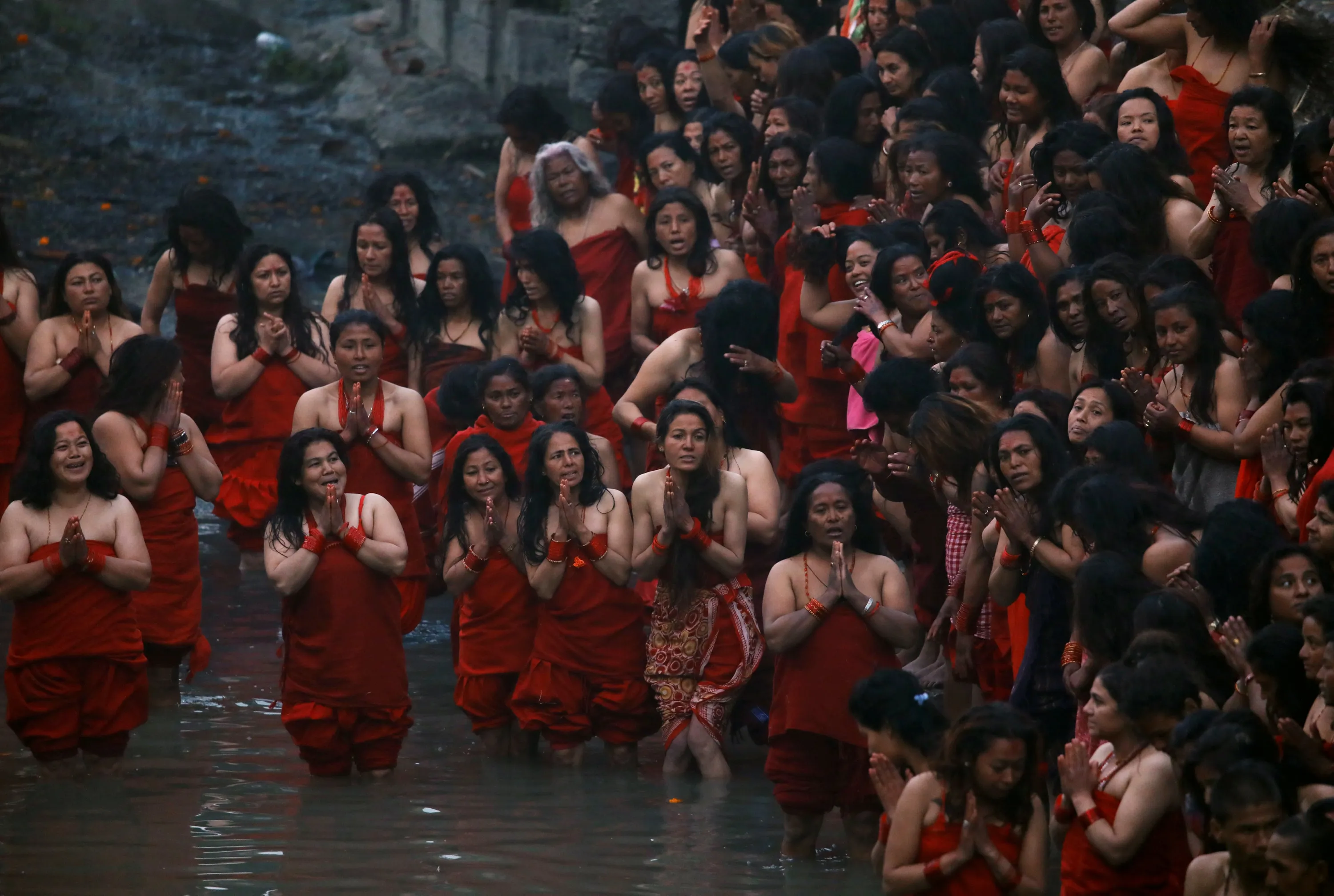 Devotees offer prayers before taking a holy bath in the Bagmati River at Pashupatinath Temple during the Swasthani Brata Katha festival in Kathmandu, Nepal, February 4, 2019. (Photo by Navesh Chitrakar/Reuters)