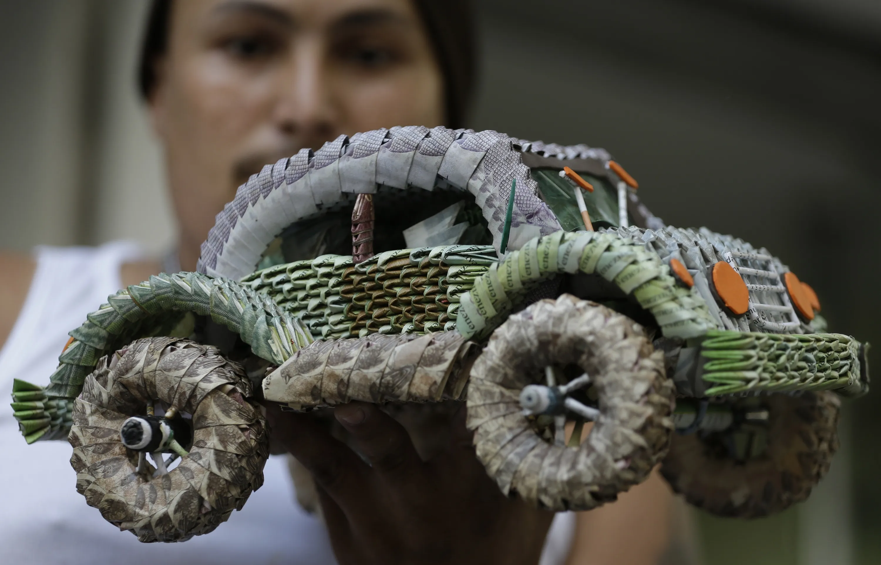 Venezuelan migrant Edixon Infante shows a handicraft made in with devalued Venezuelan currency, in Cucuta, Colombia, Wednesday, Feb. 6, 2019. The Venezuelan military blocked a border bridge where humanitarian aid is expected to arrive with a tanker and two cargo trailers, Colombian officials said Monday, in an apparent bid to stop the loads of food and other supplies from entering the country. (Photo by Fernando Vergara/AP Photo)