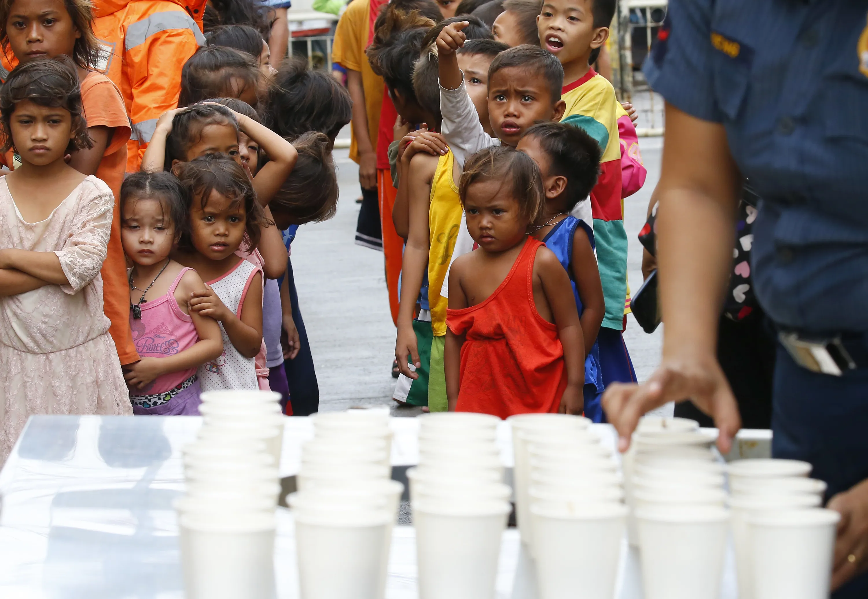 Residents living along the coastal community of Baseco wait to receive rice porridge as they seek temporary shelter at an evacuation center in the onslaught of Typhoon Mangkhut which barreled into northeastern Philippines before dawn Saturday, September 15, 2018 in Manila, Philippines. Philippine officials were assessing damage and checking on possible casualties as Typhoon Mangkhut on Saturday pummeled the northern breadbasket with ferocious wind and rain that set off landslides, damaged an airport terminal and ripped off tin roofs. (Photo by Bullit Marquez/AP Photo)