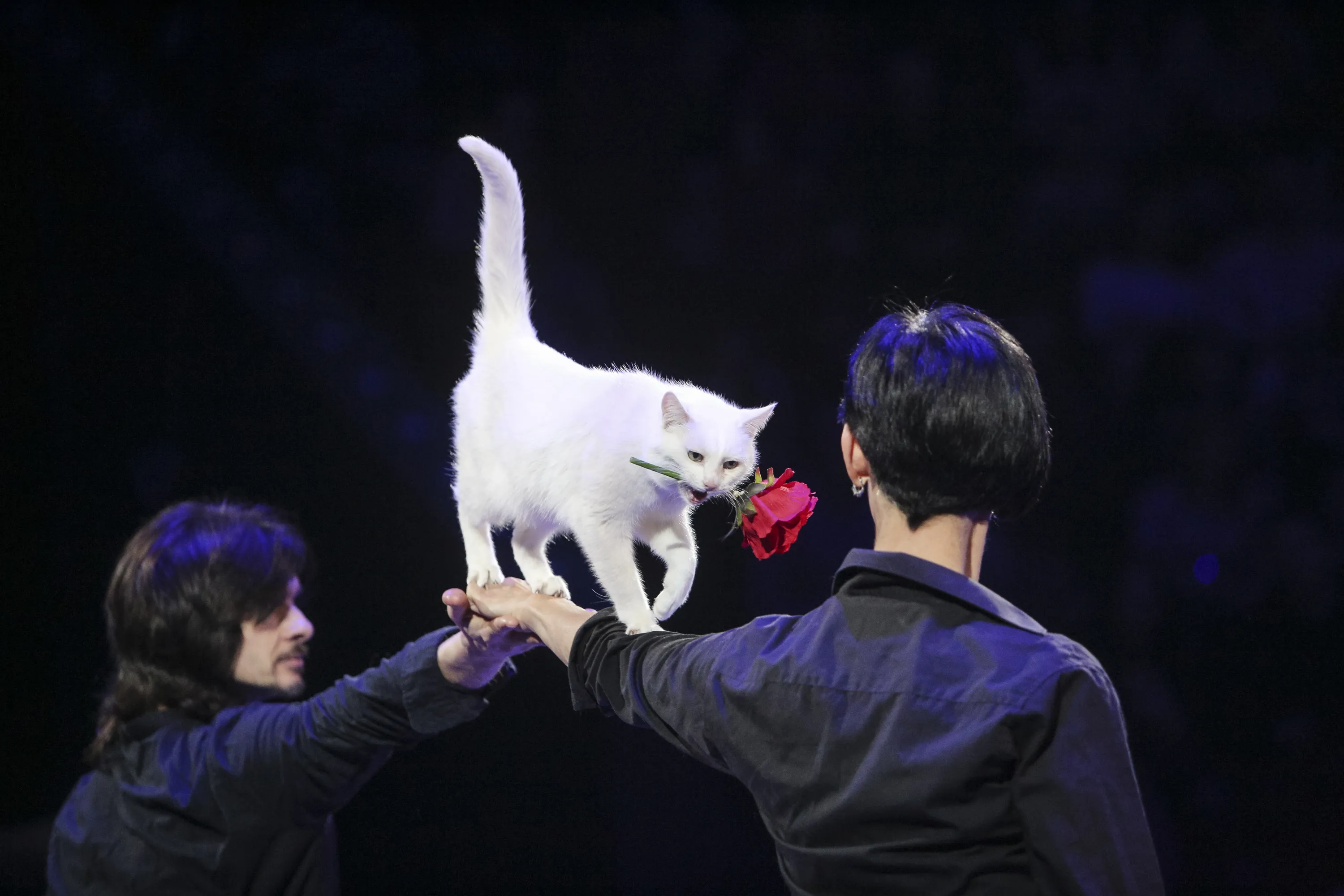 A cat and its tamers perform during the presentation of the Modern German Circus international show “Black and White, Up and Down” at the National Circus in Kyiv, Ukraine, February 1, 2019 (Photo by Sergii Kharchenko/NurPhoto via Getty Images)