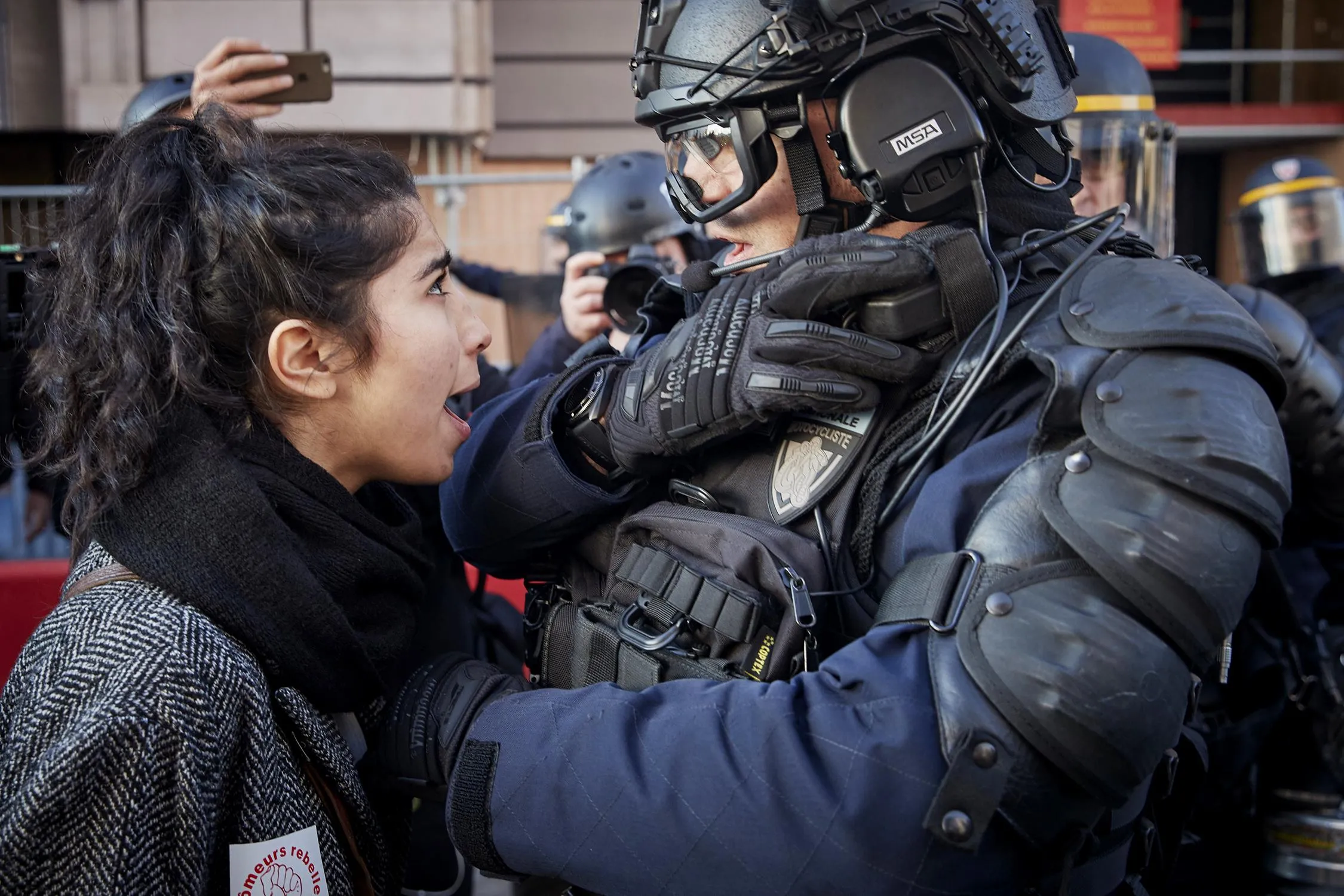 An angry protestor confronts French Riot Police after peaceful demonstrations, which were part of National General Strike along the Rue de Rivoli, turned violent on February 05, 2019 in Paris, France. The strike, led by the CGT Union, with four other unions also taking part, is in answer to President Macron’s Great National Debate and calls for a rise in the national minimum wage and for fair taxation, claims also held by the Gilets Jaunes, and may be the start of another routine called “Les mardis d'urgence socialist” (the social emergency Tuesdays). The strike is set to effect railways, schools, tourist attractions, taxi’s and public services around the city. (Photo by Kiran Ridley/Getty Images) (Photo by Kiran Ridley/Getty Images)