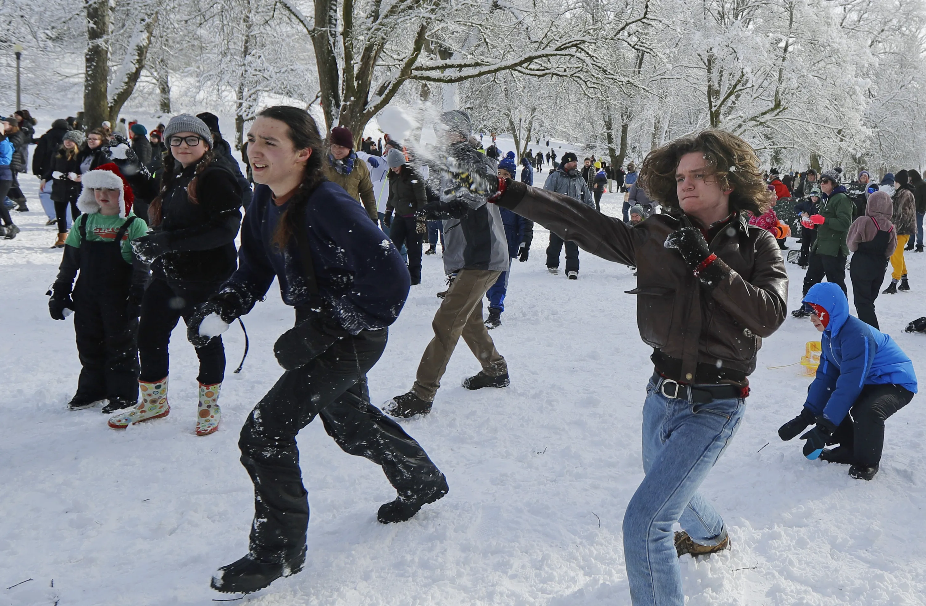 Several hundred people take part in a public snowball fight, Saturday, February 9, 2019, at Wright Park in Tacoma, Wash. Word of the friendly battle spread on social media Friday night and Saturday, as a winter storm that blanketed Washington state with snow moved south into Oregon and meteorologists warned that yet more winter weather was on the way. (Photo by Ted S. Warren/AP Photo)