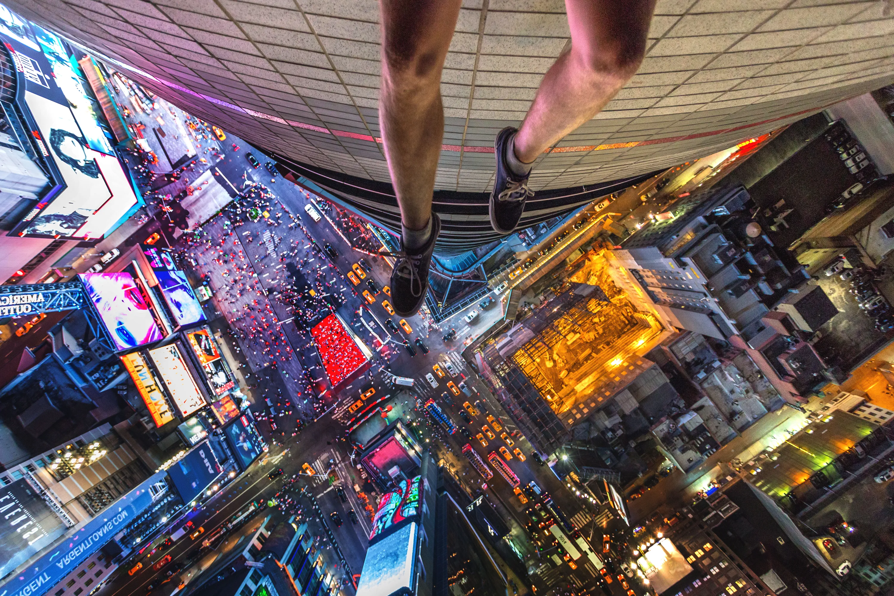 Andrej Ciesielski dangels his legs off the side of a building overlooking Times Square, New York City. (Photo by Andrej Ciesielski/Caters News Agency)