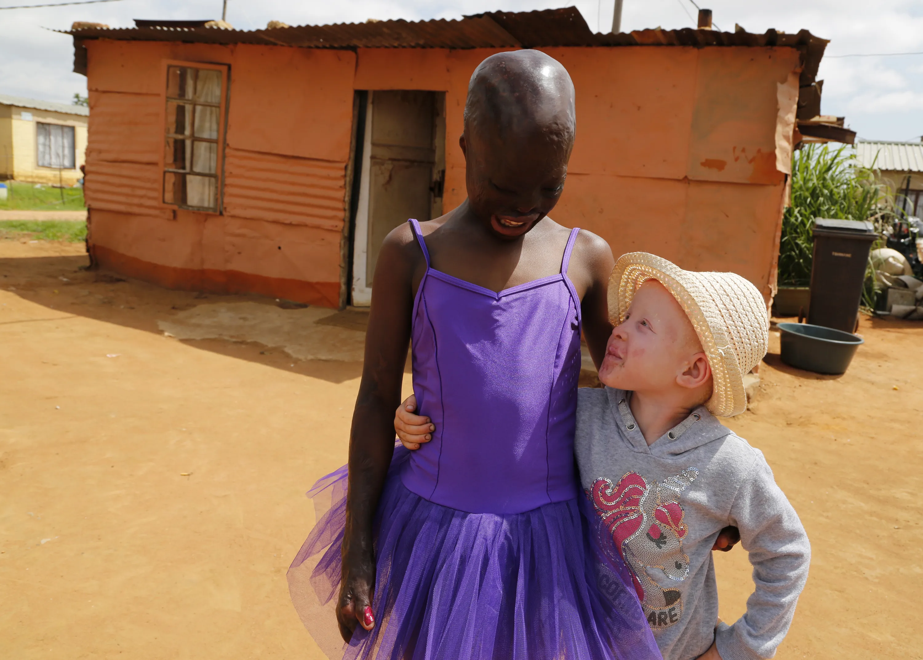 In this photo taken Sunday, January 6, 2019, 11-year-old burn victim Perlucia Mathebule, left, and her 4-year-old sister, Buhle who has albinism, pose for a photograph outside their one-room shack in Ekangala, South Africa, where the two are spending rare time with one another during the school holidays. Perlucia was badly burned at the age of 6 months and Buhle was born with albinism. (Photo by Denis Farrell/AP Photo)