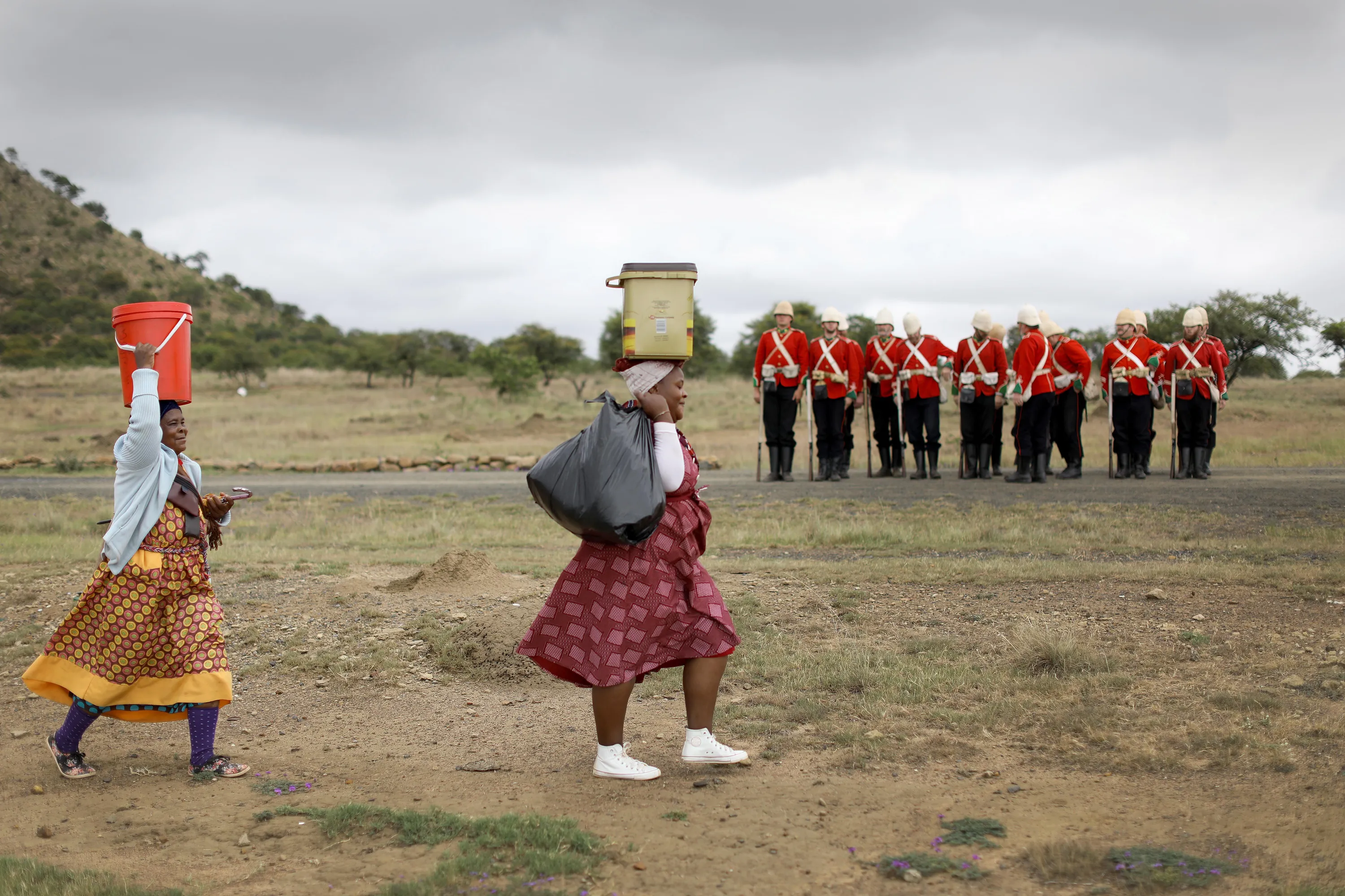 Members of a re-enactment group perform as British Soldiers as local women walk by during the 140th anniversary re-enectment of the Battle of Isandluana in Dundee, South Africa, 25 January 2019. The battle happened during the Anglo-Zulu Wars in 1879 and was the first between the Zulu nation and the British. 20,000 Zulu's attacked 1,800 British soldiers. The Zulu's ultimately overwelmed the British and won the battle. (Photo by Kim Ludbrook/EPA/EFE)