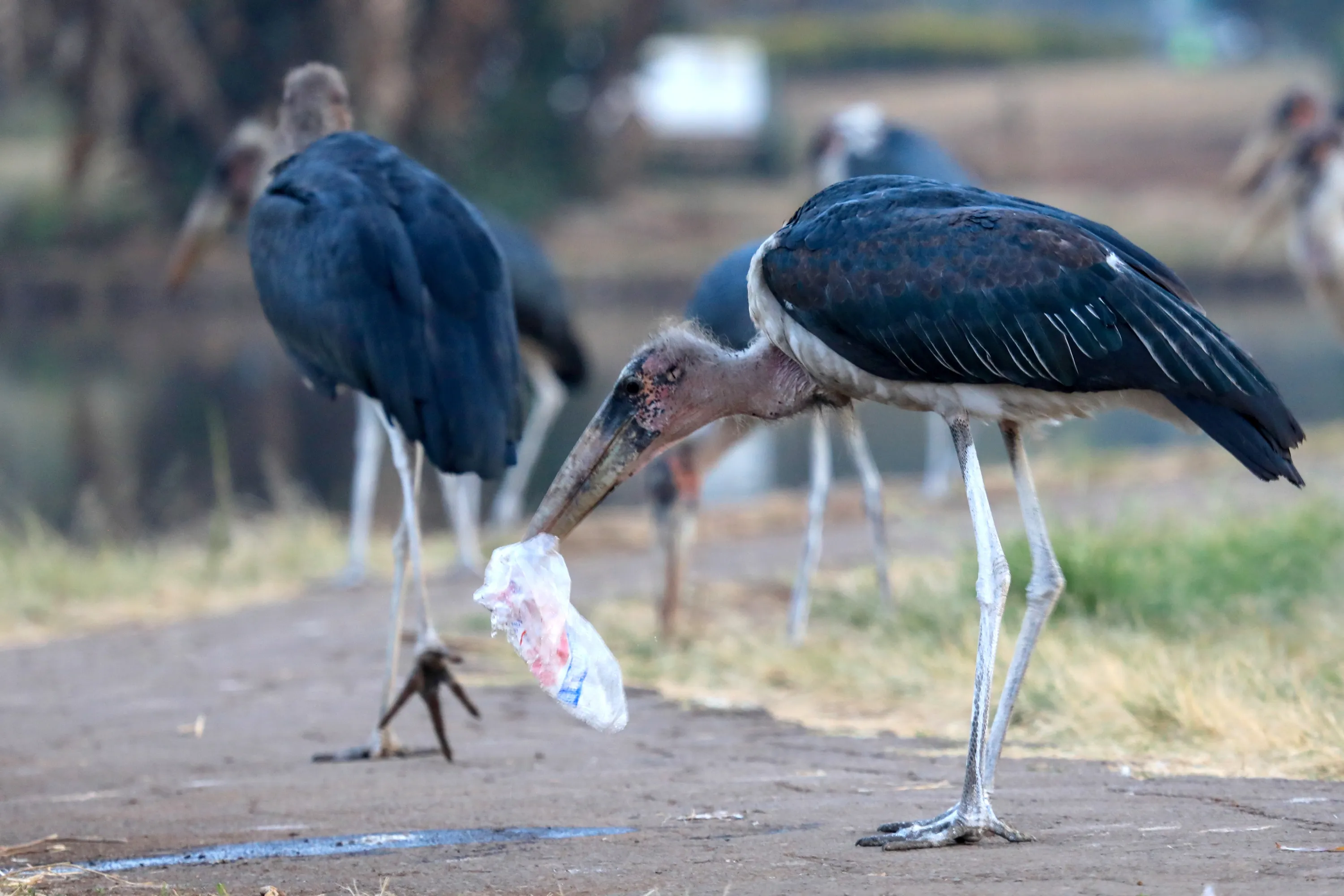 A marabou stork bird tries to feed on a plastic paper after getting it from a fish market at Uhuru Park in Nairobi, Kenya, 12 February 2019. (Photo by Daniel Irungu/EPA/EFE)