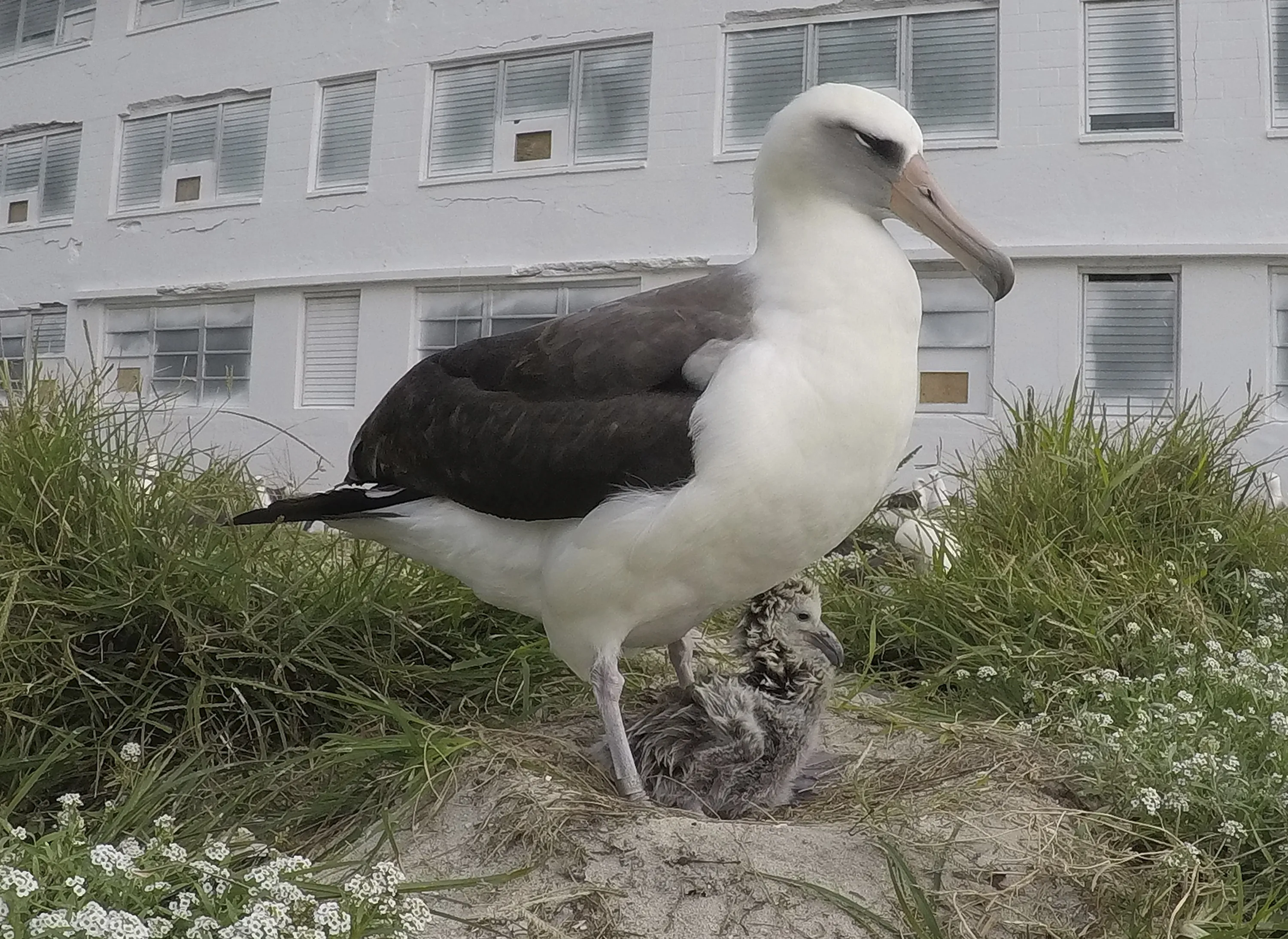 In this 2018 photo provided by the U.S. Fish and Wildlife Service is Wisdom, the world's oldest known breeding bird with a chick sits in a nest at the Midway Atoll National Wildlife Refuge and Battle of Midway National Memorial. Federal wildlife officials say the world's oldest known wild bird has become a mother again at Midway Atoll National Wildlife Refuge. The Honolulu Star-Advertiser reports the Laysan albatross named Wisdom hatched a chick earlier this month at the remote atoll northwest of Hawaii. U.S. Fish and Wildlife Service officials say Wisdom is at least 68 years old and has raised at least 31 chicks. (Photo by Bob Peyton/U.S. Fish and Wildlife Service via AP Photo)
