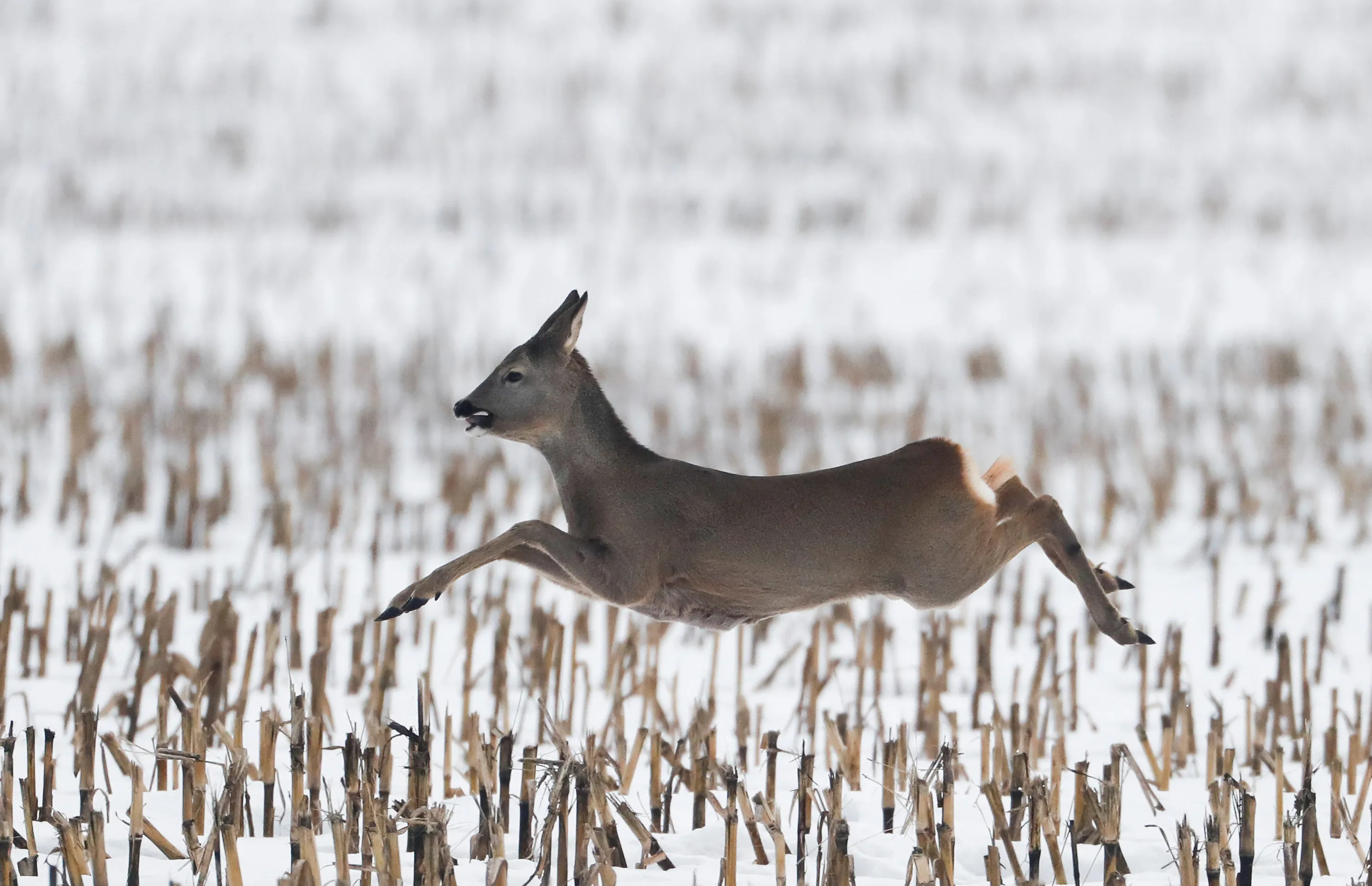 A roe deer runs in a field near the village of Garadishche, Belarus February 10, 2019. (Photo by Vasily Fedosenko/Reuters)