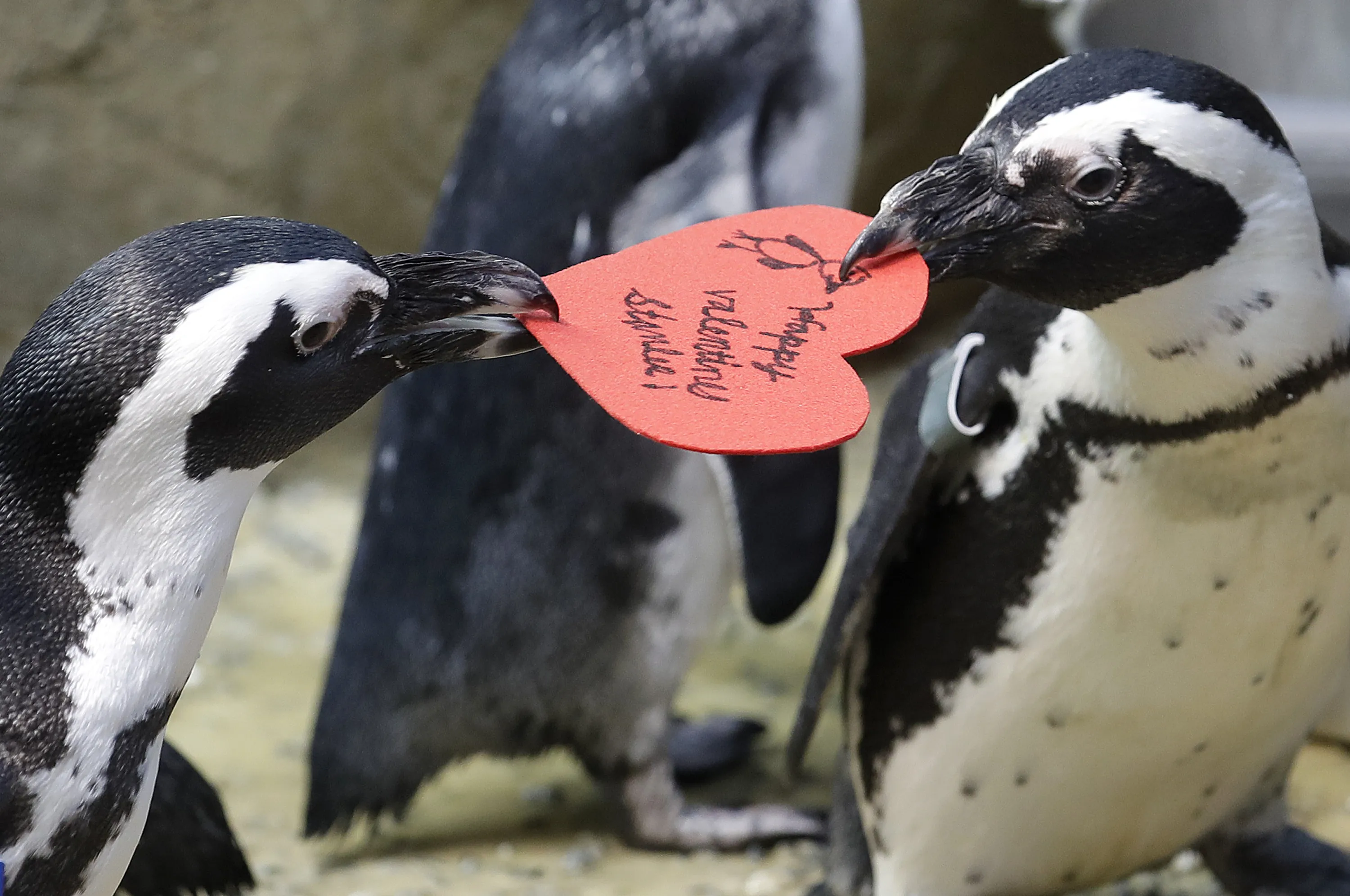 African penguins compete for a heart shaped valentine handed out by aquarium biologist Piper Dwight at the California Academy of Sciences in San Francisco, Tuesday, February 12, 2019. The hearts were handed out to the penguins who naturally use similar material to build nests in the wild. (Photo by Jeff Chiu/AP Photo)