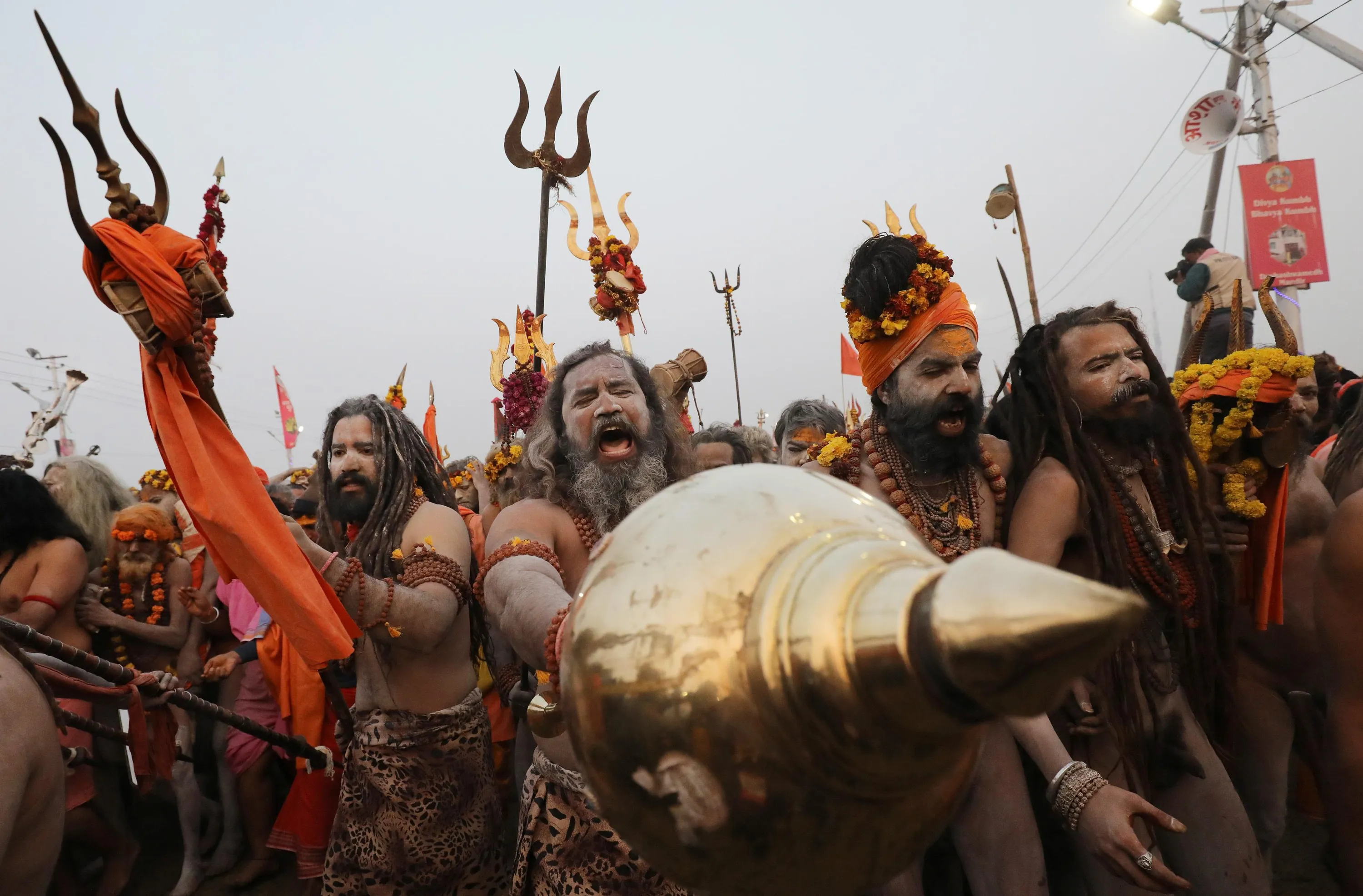 Naga Sadhus or Hindu holy men arrive to take a holy dip during the second “Shahi Snan” (grand bath) at the “Kumbh Mela” or the Pitcher Festival, in Prayagraj, previously known as Allahabad, India, February 4, 2019. (Photo by Anushree Fadnavis/Reuters)