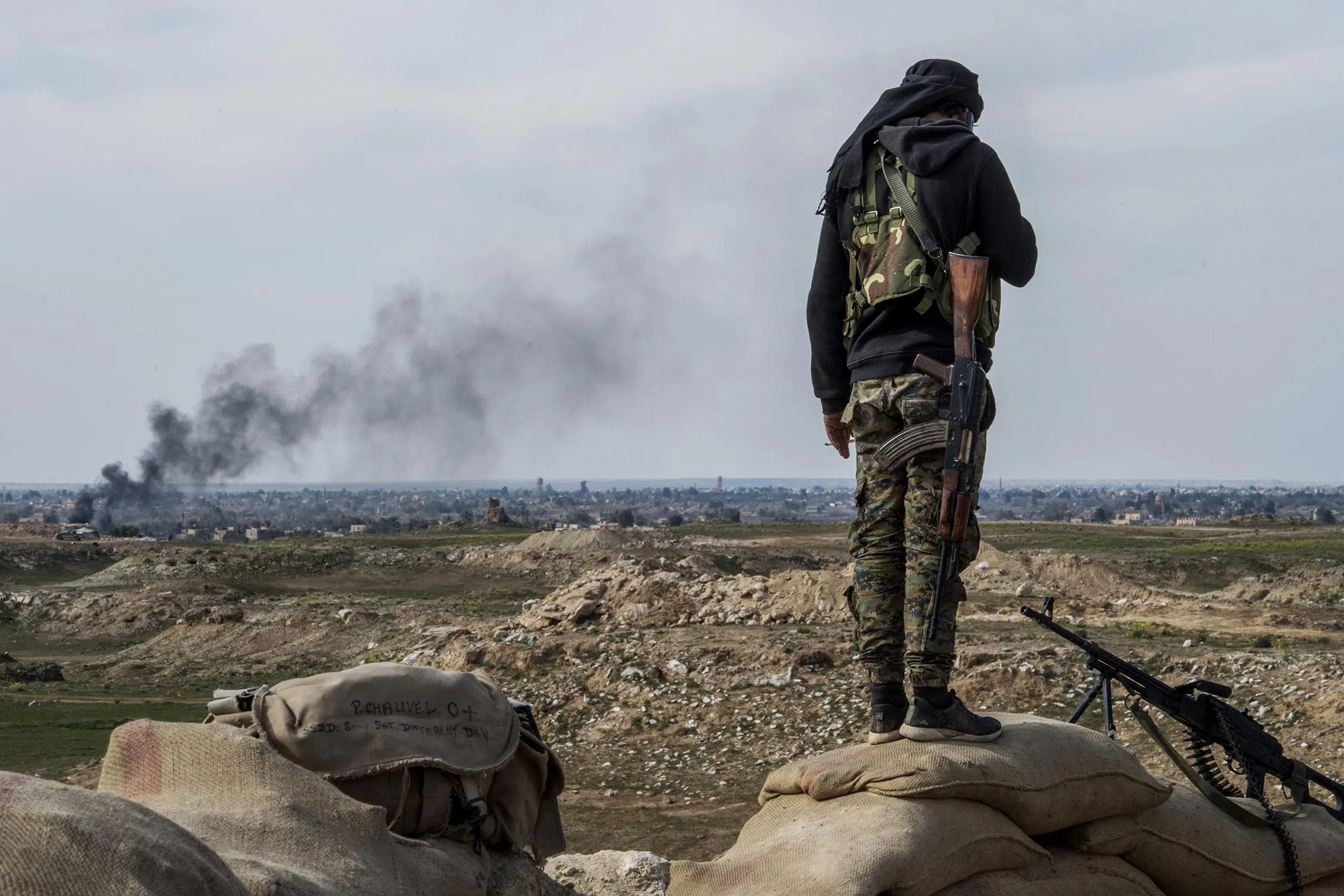 A fighter with the US-backed Syrian Democratic Forces (SDF) keeps position during an operation to expel Islamic State group (IS) jihadists from the Baghouz area in the eastern Syrian province of Deir Ezzor on February 13, 2019. Syrian fighters backed by artillery fire from a US-led coalition battled a fierce jihadist counteroffensive as they pushed to retake a last morsel of territory from the Islamic State group in an assault lasting days. More than four years after the extremists declared a “caliphate” across large parts of Syria and neighbouring Iraq, several offensives have whittled that down to a tiny scrap of land in eastern Syria. (Photo by Fadel Senna/AFP Photo)