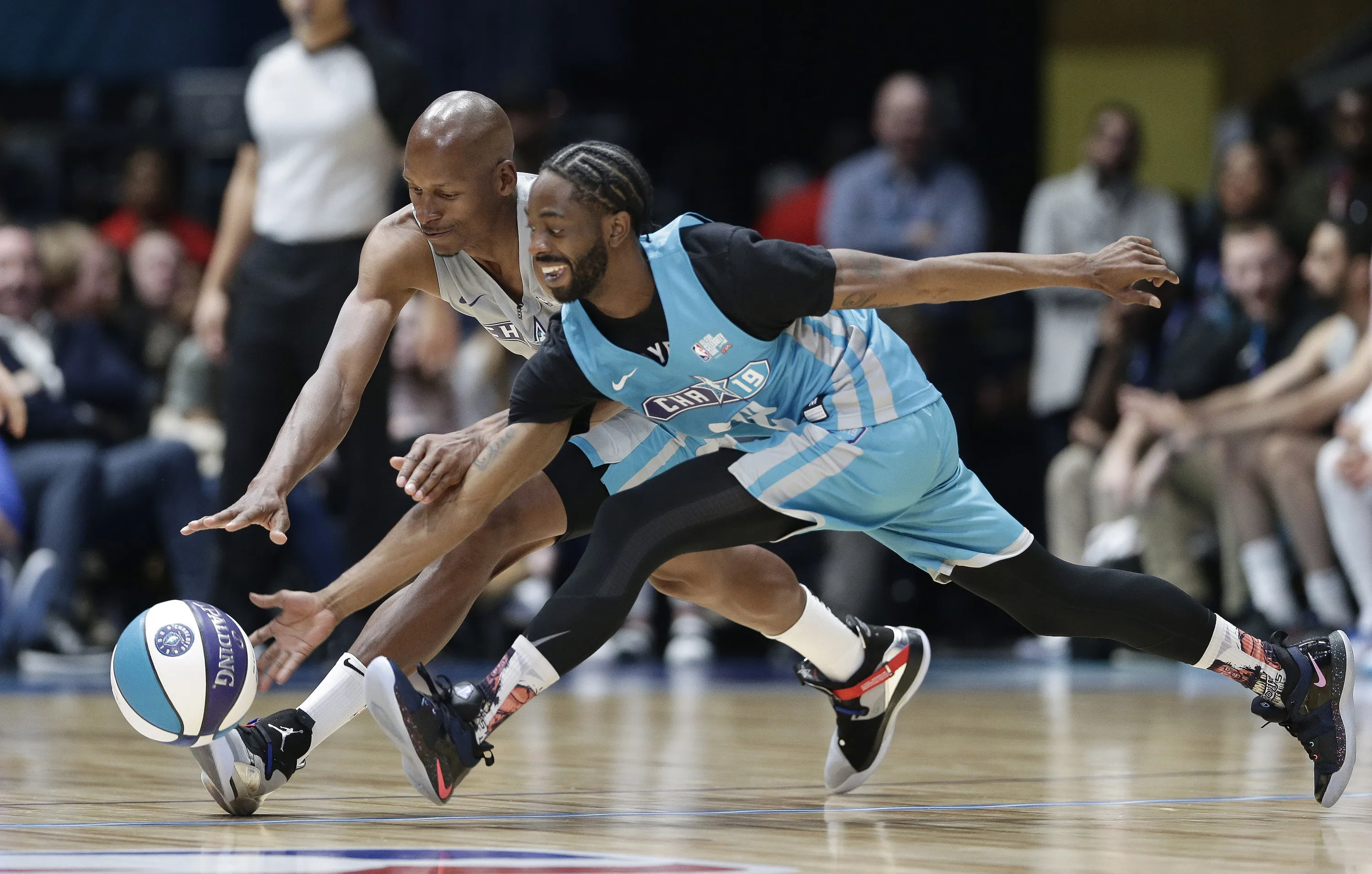 Home team's Famous Los, right, and Away team's Ray Allen chase the ball during the first half of an NBA All-Star Celebrity basketball game in Charlotte, N.C., Friday, February 15, 2019. (Photo by Gerry Broome/AP Photo)