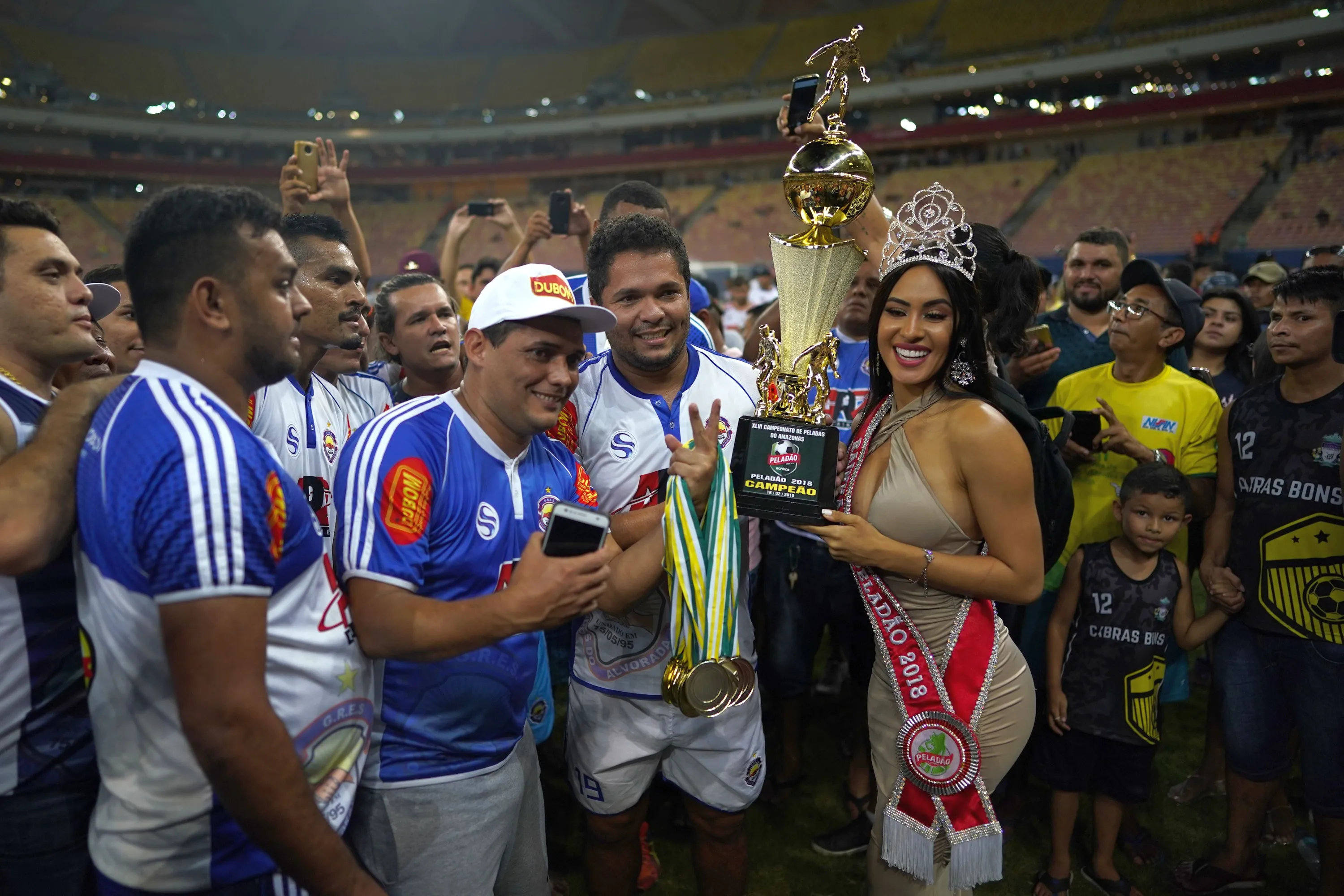 Alvorada soccer team players and staff pose with beauty Queen Isabelle Nogueira who holds their trophy after winning the Peladao amateur soccer tournament final at Arena da Amazonia in Manaus, Brazil, on Saturday, February 16, 2019. All men's teams must have a candidate for queen of the Peladao, and if the woman they chose for some reason abandons the bid before she has been disqualified, her team is removed from contention. (Photo by Victor R. Caivano/AP Photo)