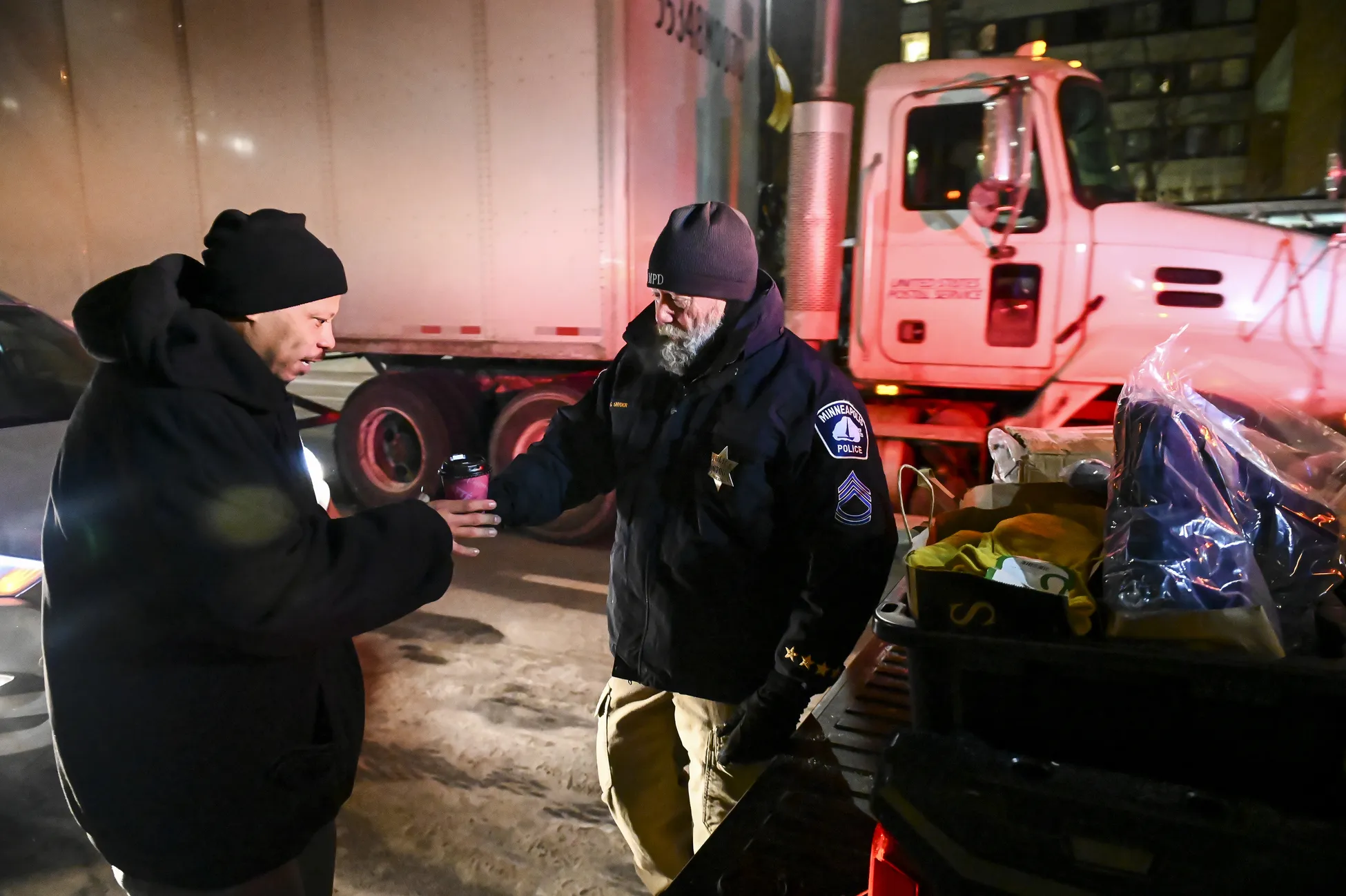 Minneapolis Police Sgt. Grant Snyder, right, hands a cup of hot chocolate to Dawone Boclair outside the public library on Hennepin Avenue in downtown Minneapolis, as the temperatures dipped well below freezing, Tuesday, January 29, 2019. Snyder will be hitting the streets Tuesday and Wednesday night during the height of the big chill to check on the welfare of homeless people who haven't made it into a shelter. (Photo by Aaron Lavinsky/Star Tribune via AP Photo)