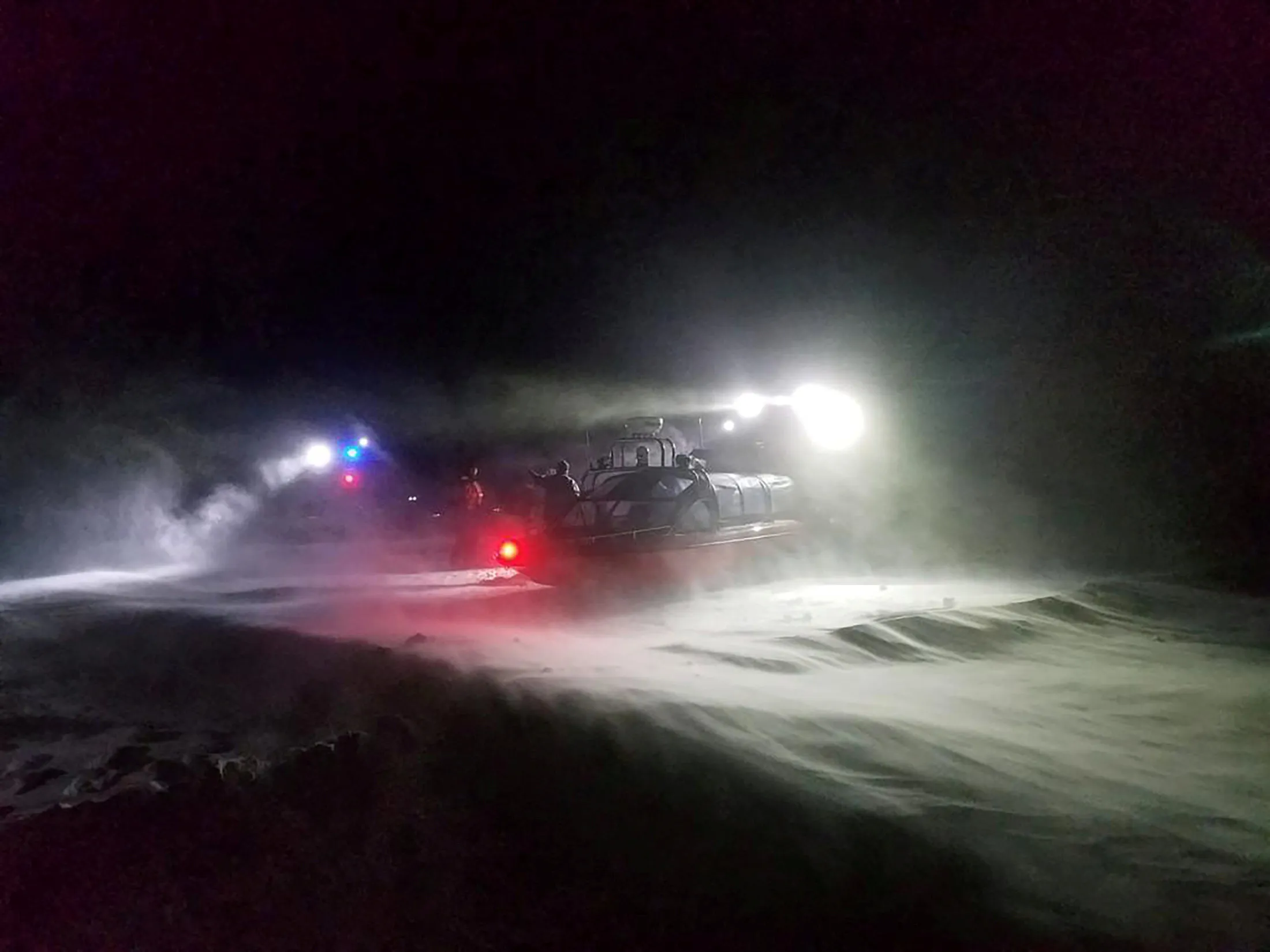 U.S. Coast Guard Station Sturgeon Bay and Department of Natural Resources crews direct seven stranded ice fishermen into airboats, in polar vortex weather system temperatures of minus 4 degrees Fahrenheit (-20 C) with a wind chill factor of minus 30 degrees (-34 C) near Sturgeon Bay, Wisconsin, U.S. January 29, 2019. Picture taken January 29, 2019. (Photo by U.S. Coast Guard/DNR officer Jordan Resop/Handout via Reuters)