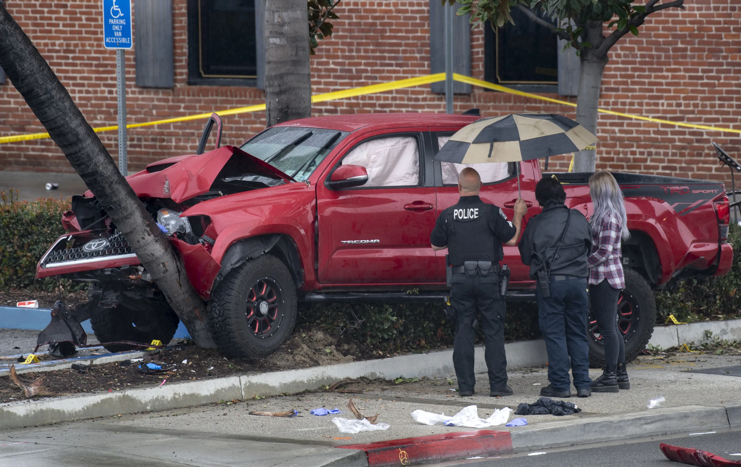 Fullerton Police investigate an early-morning accident that injured several pedestrians, Sunday, February 10, 2019, in Fullerton, Calif. Authorities say a suspected drunken driver was arrested after his pickup truck plowed into a crowd on a sidewalk, injuring multiple people, including some victims who were trapped under the vehicle. (Photo by Mindy Schauer/The Orange County Register via AP Photo)