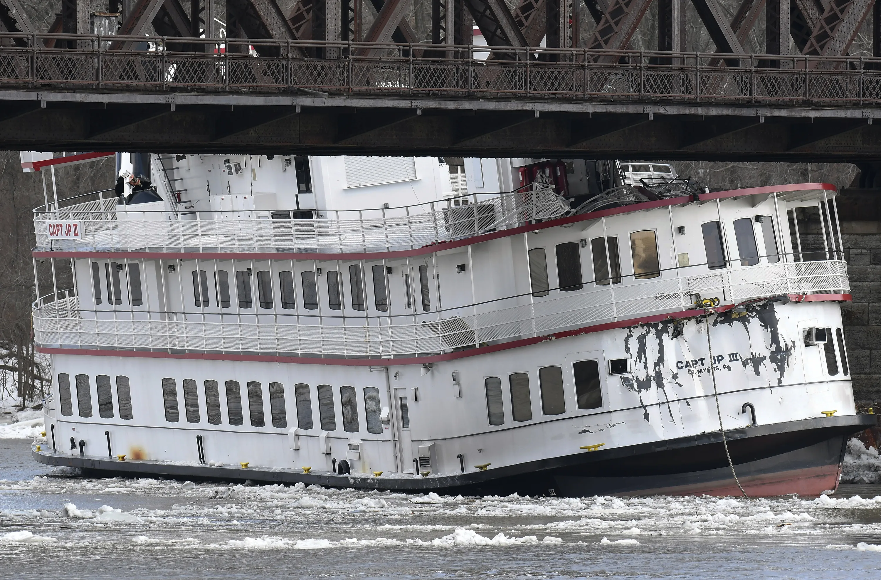 Captain JP III cruise ship is wedged against the Livingston Avenue train bridge that spans the Hudson River in Albany, N.Y., Friday, January 25, 2019. The unoccupied Hudson River cruise ship broke loose from its moorings amid rising water and ice jams, floated slowly downriver and is jammed under a rail bridge. (Photo by Hans Pennink/AP Photo)