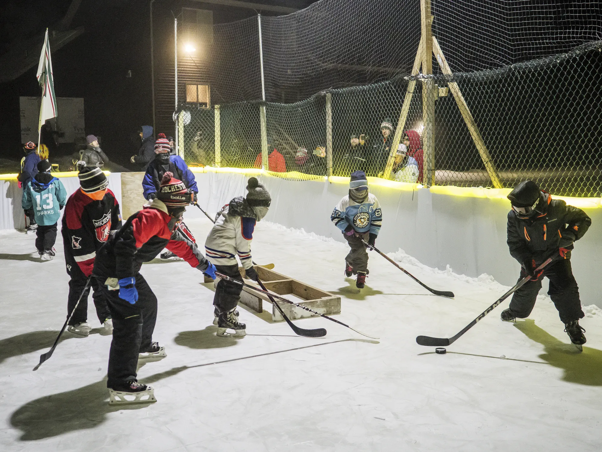 Hockey players chase the puck during an attempt at the Guinness Book of World Records record for coldest hockey game played Thursday, January 31, 2019, in the backyard belonging to Mike Burman in northwest Rochester, Minn. About 25 kids took to the ice in the attempt. The air temperature, according to the National Weather Service, was in the high 20s below zero, and the wind chill was in the mid-40s below zero. (Photo by Joe Ahlquist/The Rochester Post-Bulletin via AP Photo)