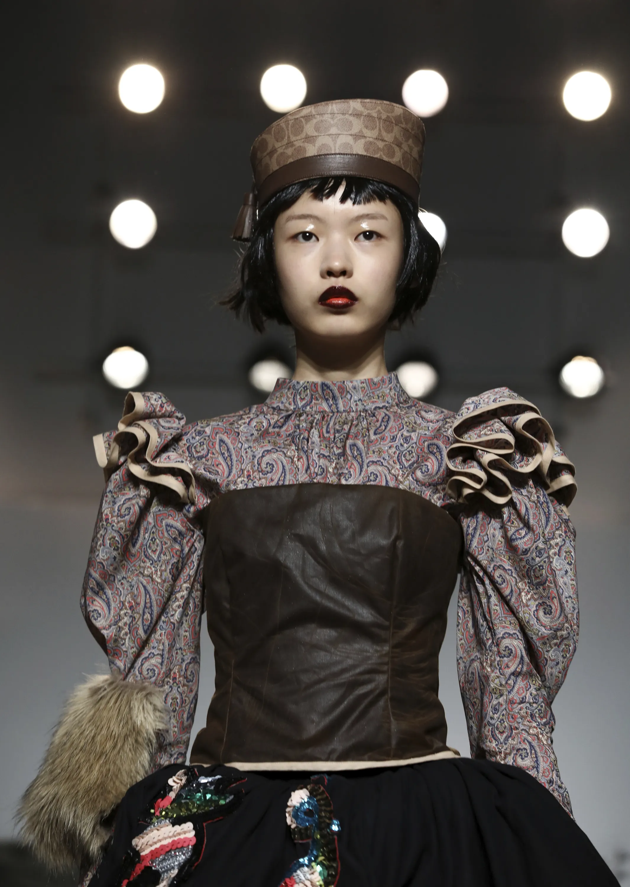 A model wears a creation by designer Matty Bovan at the Autumn/Winter 2019 fashion week runway show in London, Friday, February 15, 2019.(Photo by Grant Pollard/Invision/AP Photo)