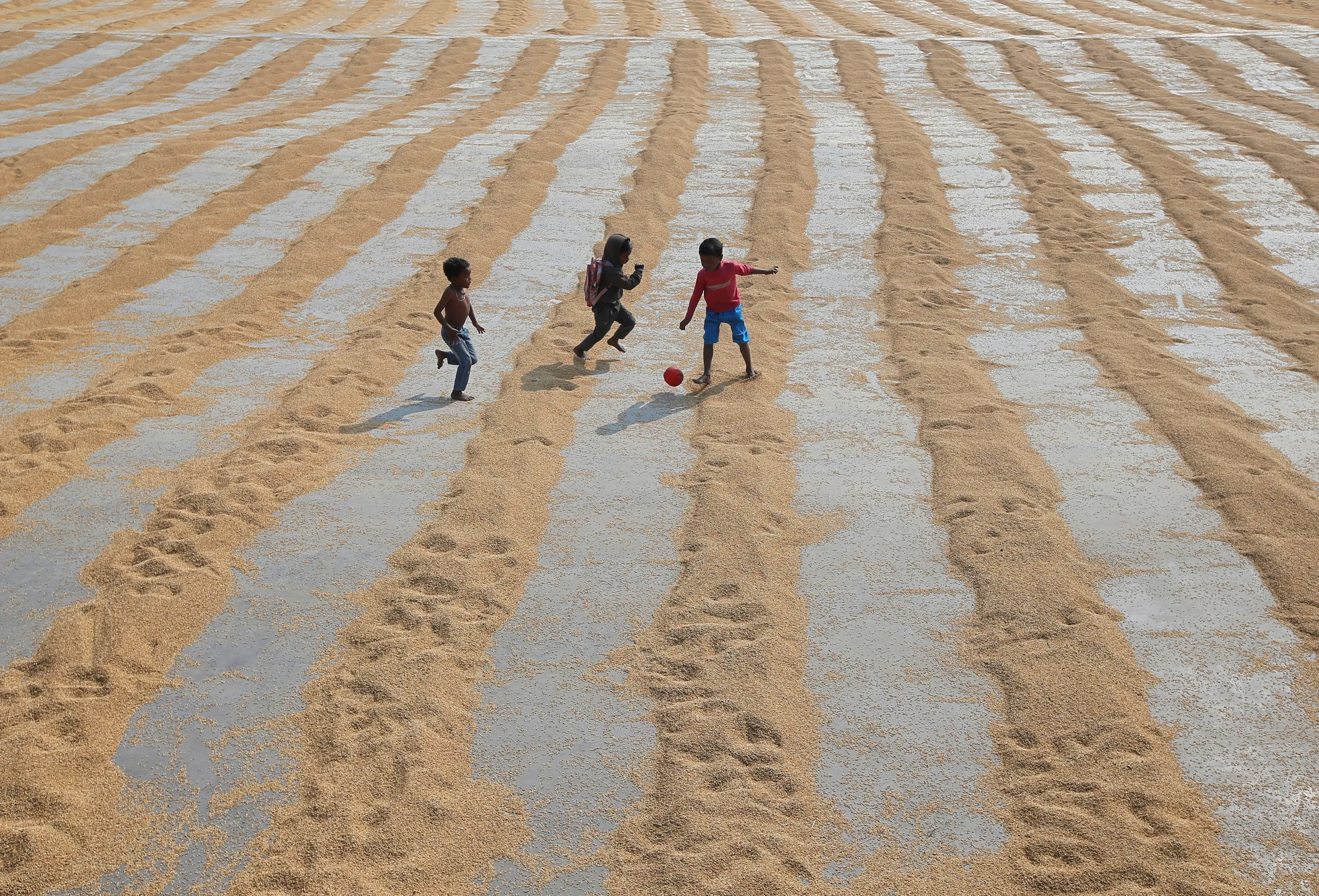 Children play with a ball after rice is spread for drying at a rice mill on the outskirts of Kolkata, India, January 31, 2019. (Photo by Rupak De Chowdhuri/Reuters)