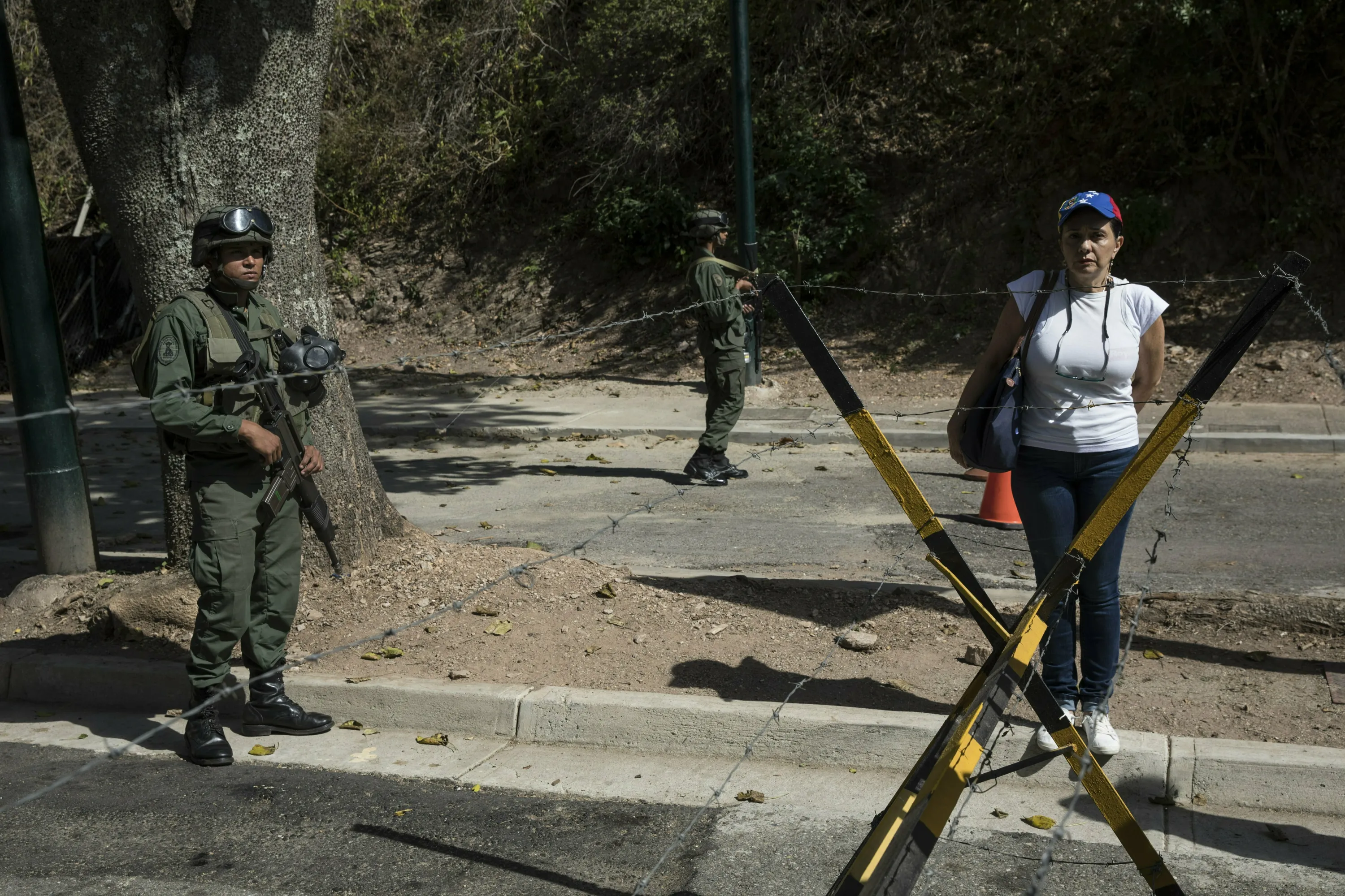 A woman stands next to soldiers as other members of the opposition hand out copies of an amnesty law near Ft. Tiuna military base in Caracas, Venezuela, Sunday, January 27, 2019. Opposition National Assembly leader Juan Guaido, who declared himself interim president, said Friday that he would release the text of an existing amnesty law that would pardon members of the military who cooperate in restoring democracy and asked Venezuelans to share it with officers they know. (Photo by Rodrigo Abd/AP Photo)