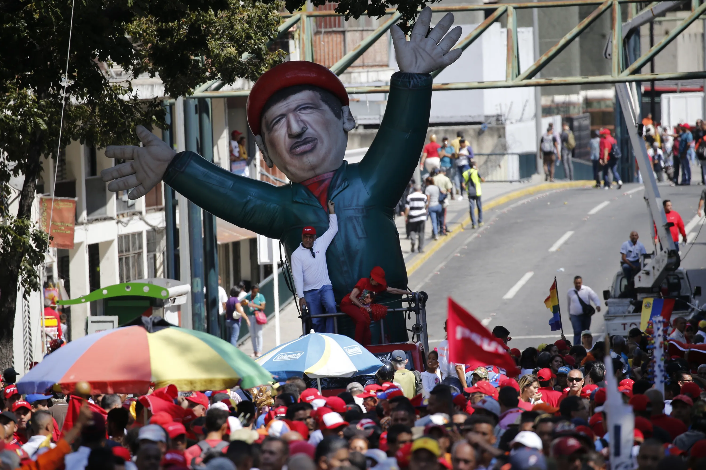 An inflatable doll depicting Venezuela's late President Hugo Chavez stands outside of Miraflores presidential palace, during a march of in defense of the state-run oil company PDVSA, in Caracas, Venezuela, Thursday, January 31, 2019. The government called for a mass rally to denounce U.S. sanctions against PDVSA that could starve Maduro's government of billions in export revenue but turnout was no more than a few hundred people. (Photo by Ariana Cubillos/AP Photo)