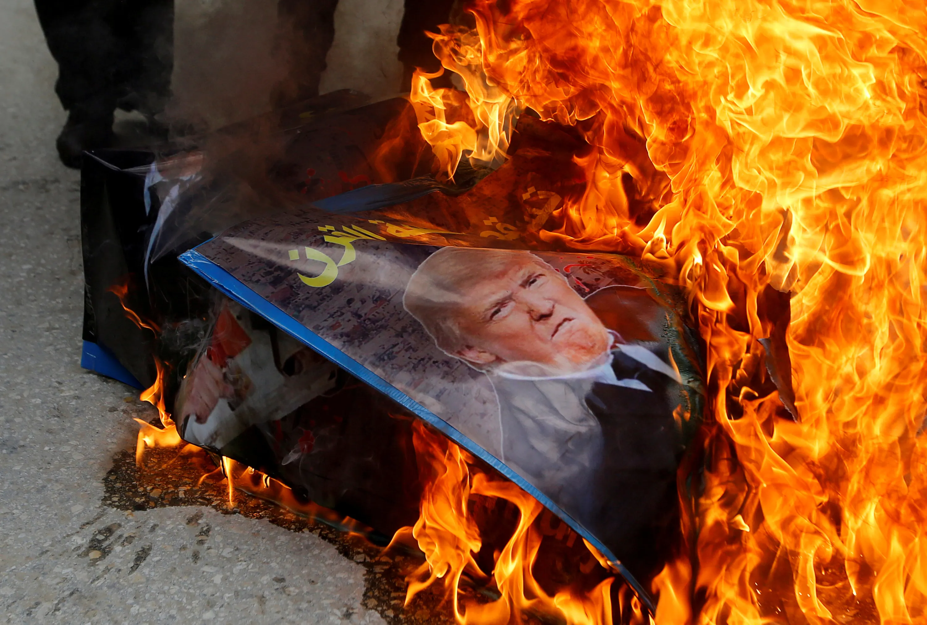 Palestinian demonstrators burn a poster depicting U.S. President Donald Trump during a protest calling for opening Shuhada Street that Israel unilaterally closed it in 1994, in Hebron, in the Israeli-occupied West Bank February 22, 2019. (Photo by Mussa Qawasma/Reuters)