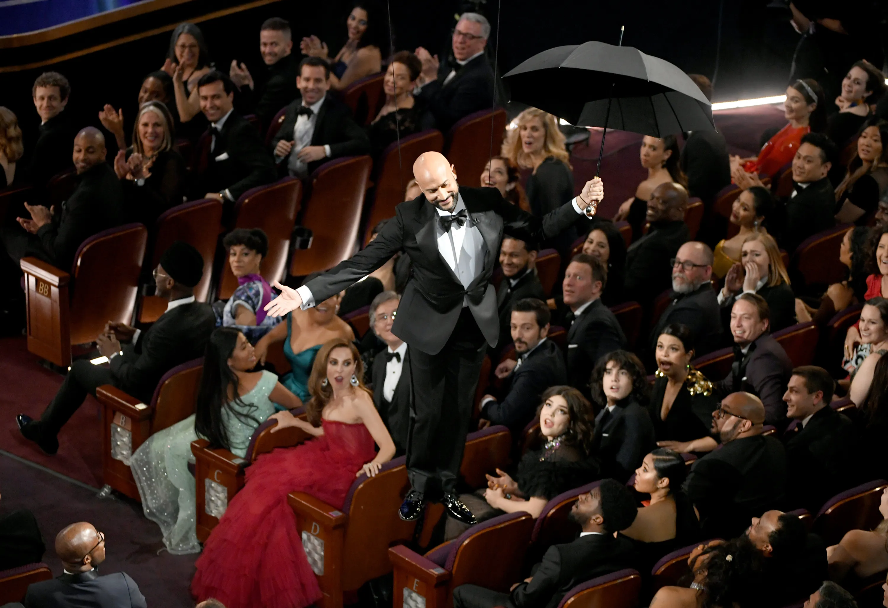 Keegan-Michael Key, one of several guests giving awards in the absence of a host, descends to the floor with an umbrella during the 91st Annual Academy Awards at Dolby Theatre on February 24, 2019 in Hollywood, California. (Photo by Kevin Winter/Getty Images)
