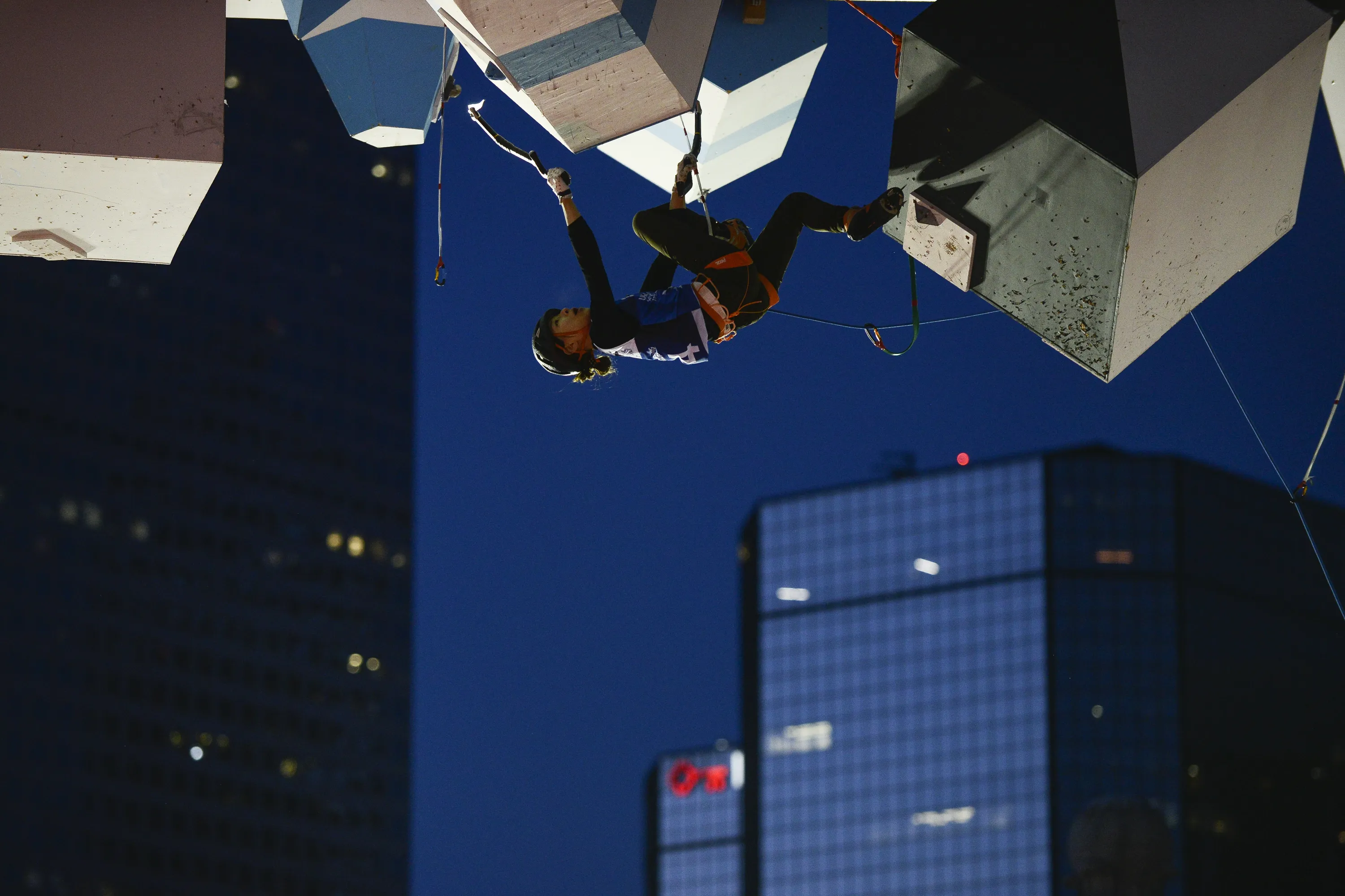 South Korean climber Woonseon Shin reaches for her next hold during her second place climb in the 2019 UIAA Ice Climbing World Cup finals on February 24, 2019 in Denver, Colorado. (Photo by Michael Ciaglo/Getty Images)