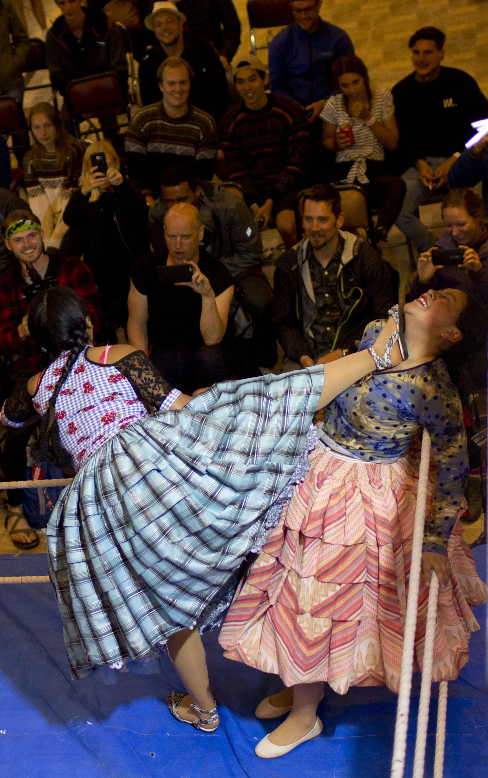 Young cholita wrestlers Wara, left, and Natalia Pepita compete in the ring in El Alto, Bolivia, Thursday, February 7, 2019. About 50 young women like Pepita and Wara are training at schools to take up the sport, some at an institution known as Independent Wrestlers of Enormous Risk. (Photo by Juan Karita/AP Photo)