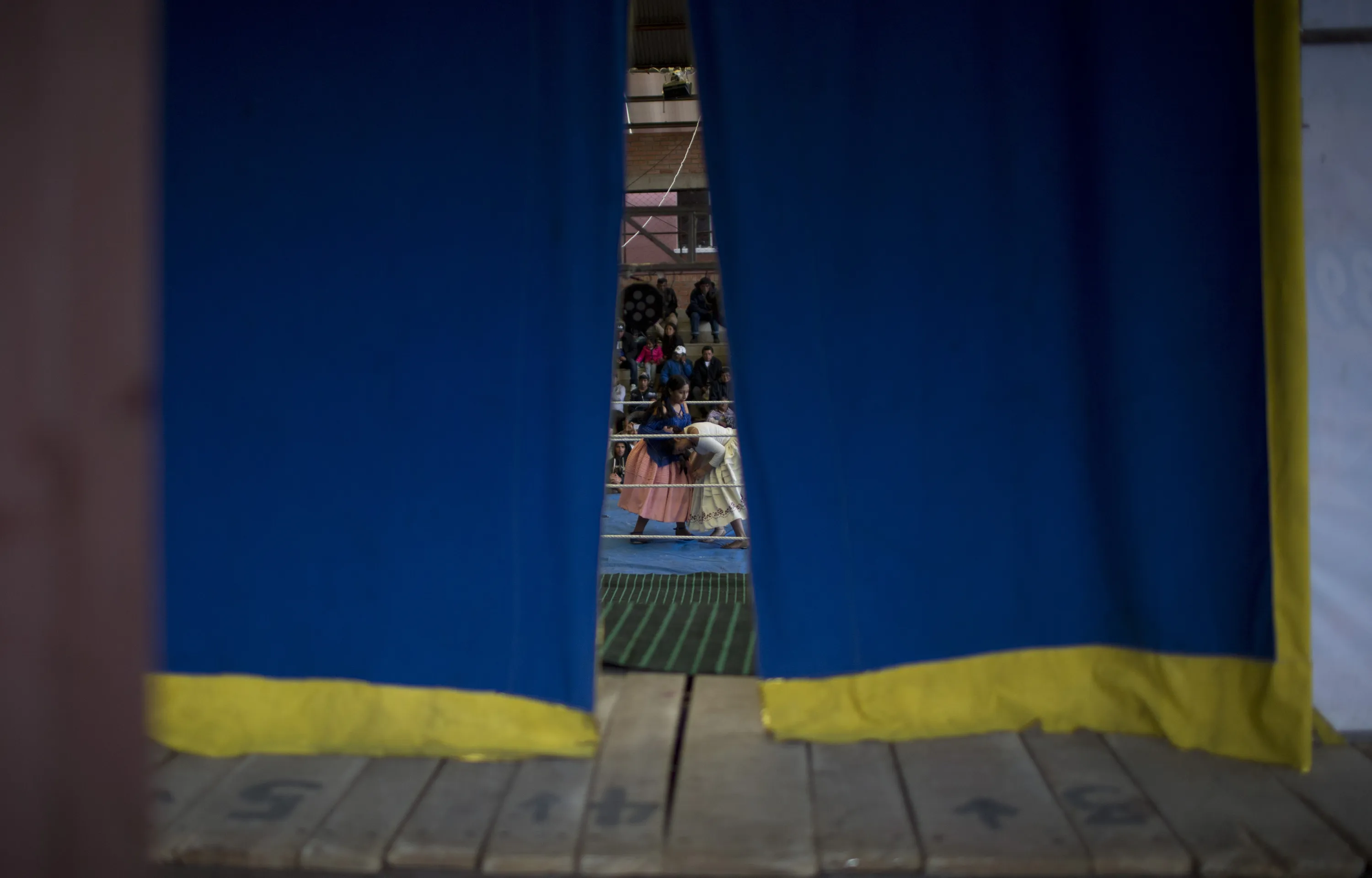 Seen from behind the backstage curtain, young cholita wrestler Dona Chevas, left, fights with fellow trainee Lucero in El Alto, Bolivia, Sunday, February 24, 2019. The shows “assert the role of the Ayamara woman, showing her as enterprising, that she too can take part in a risky sport”, said the city's tourist department Tatiana Monasterios. (Photo by Juan Karita/AP Photo)
