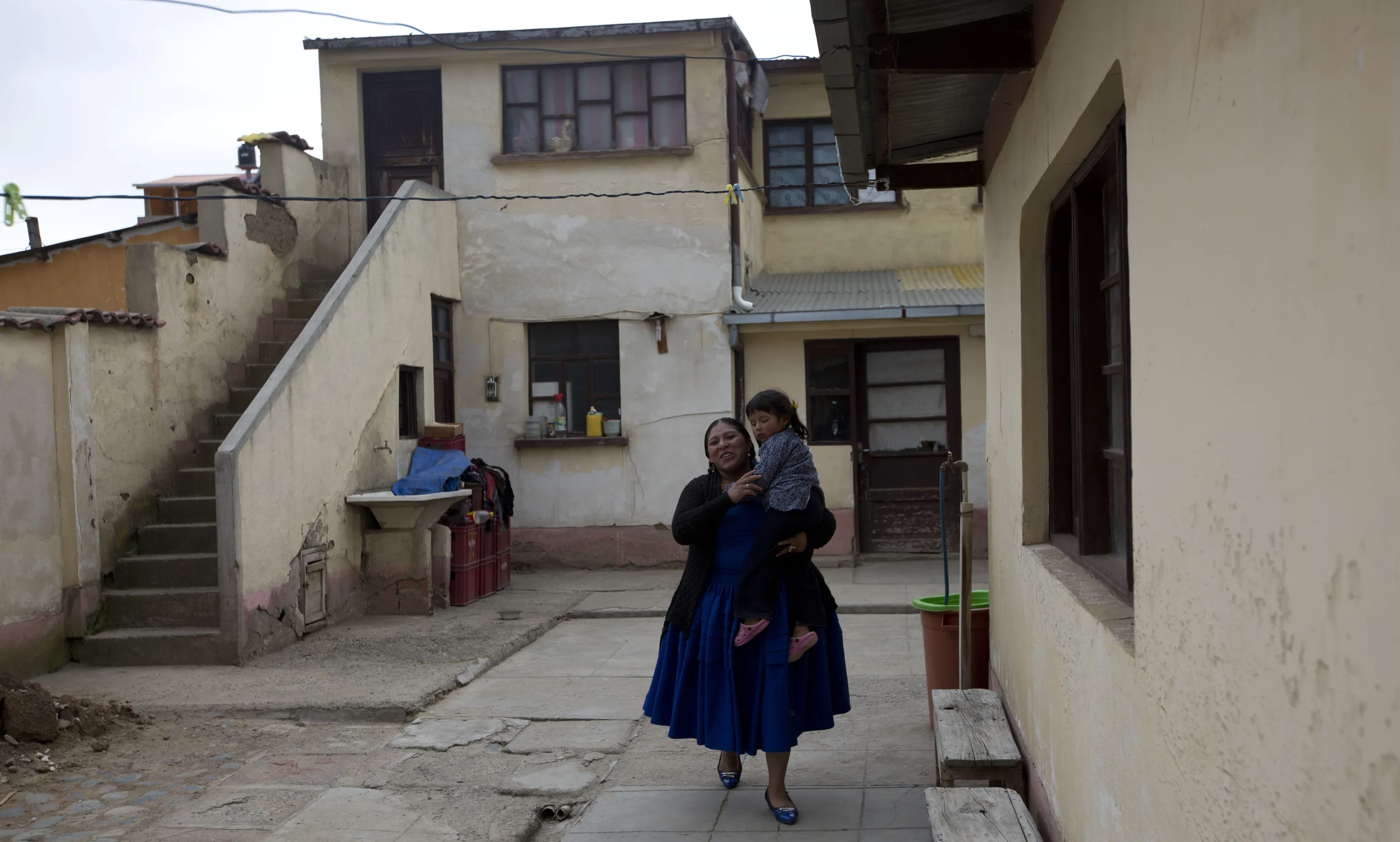 Reyna Torrez, a veteran cholita wrestler who uses the ring name Leydi Huanca, carries her daughter Lydia after an interview at her home in El Alto, Bolivia, Monday, February 18, 2019. Torrez, 29, is teaching a new generation of female wrestlers as her generation of fighters gradually dwindled to just seven. (Photo by Juan Karita/AP Photo)