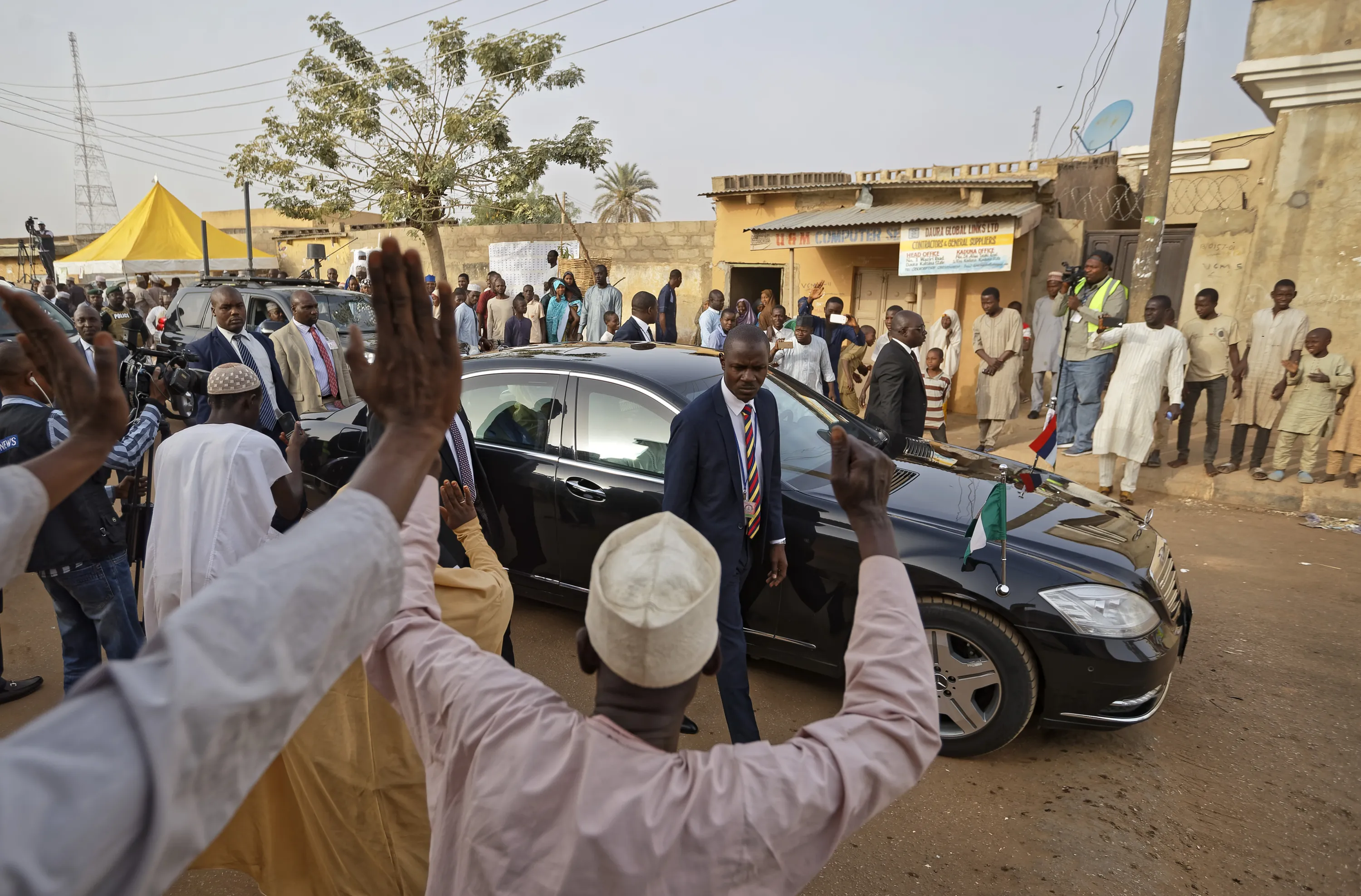 Supporters cheer as President Muhammadu Buhari leaves in his car after casting his vote in his hometown of Daura, in northern Nigeria Saturday, February 23, 2019. Nigerians are going to the polls for a presidential election Saturday, one week after a surprise delay for Africa's largest democracy. (Photo by Ben Curtis/AP Photo)