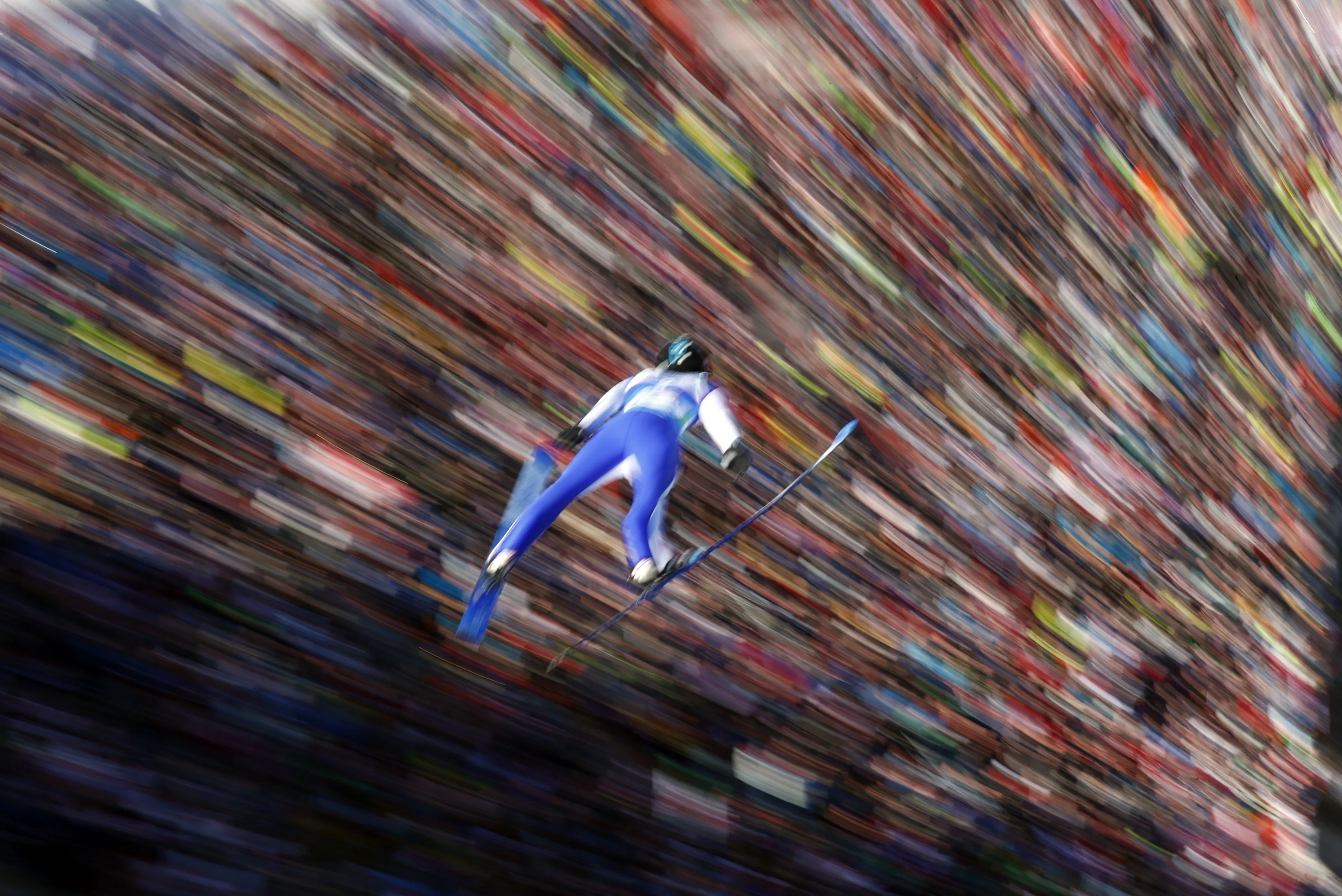 United States' Andrew Urlaub soars through the air during the Ski Jumping HS130 event, at the Nordic Ski World Championships in Innsbruck, Austria, Saturday, February 23, 2019. (Photo by Matthias Schrader/AP Photo)