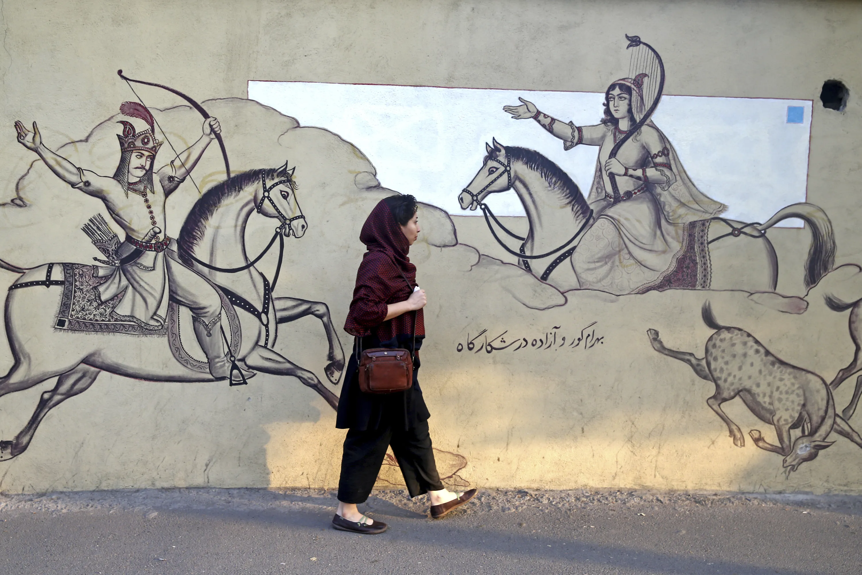 An Iranian woman walks past paintings of a Persian poetry in downtown Tehran, Iran, Monday, July 30, 2018. Iran's currency has dropped to a record low ahead of the imposition of renewed American sanctions, with many fearing prolonged economic suffering or possible civil unrest. (Photo by Ebrahim Noroozi/AP Photo)