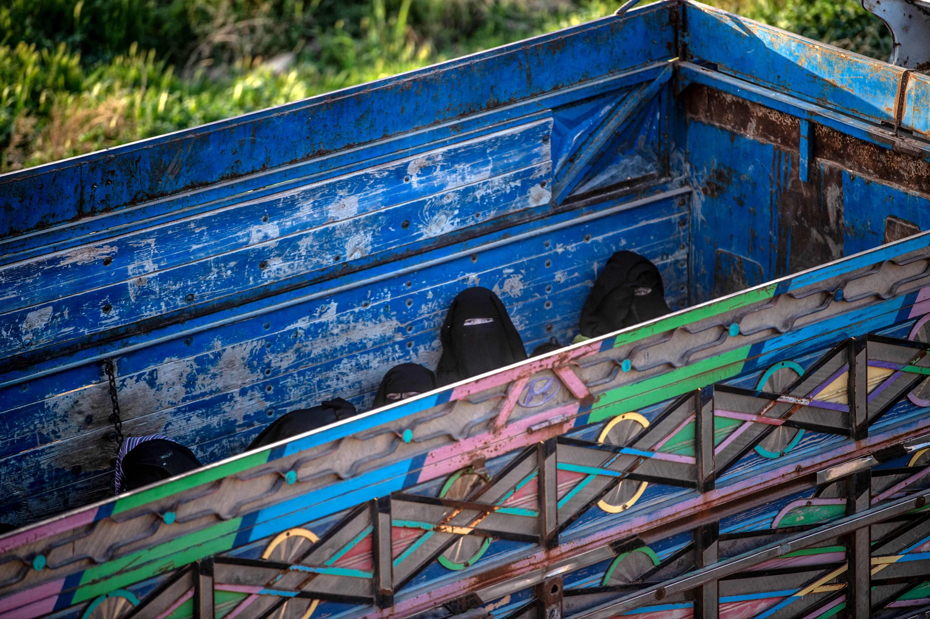 Women and children who fled the Islamic State group's last holdout of Baghouz, in Syria's northern Deir Ezzor province, ride in the back of a truck in an area controlled by the Kurdish-led Syrian Democratic Foces (SDF) on March 4, 2019. Kurdish-led forces backed by US warplanes rained artillery fire and air strikes besieged and outgunned jihadists making a desperate last stand in a Syrian village. (Photo by Bulent Kilic/AFP Photo)