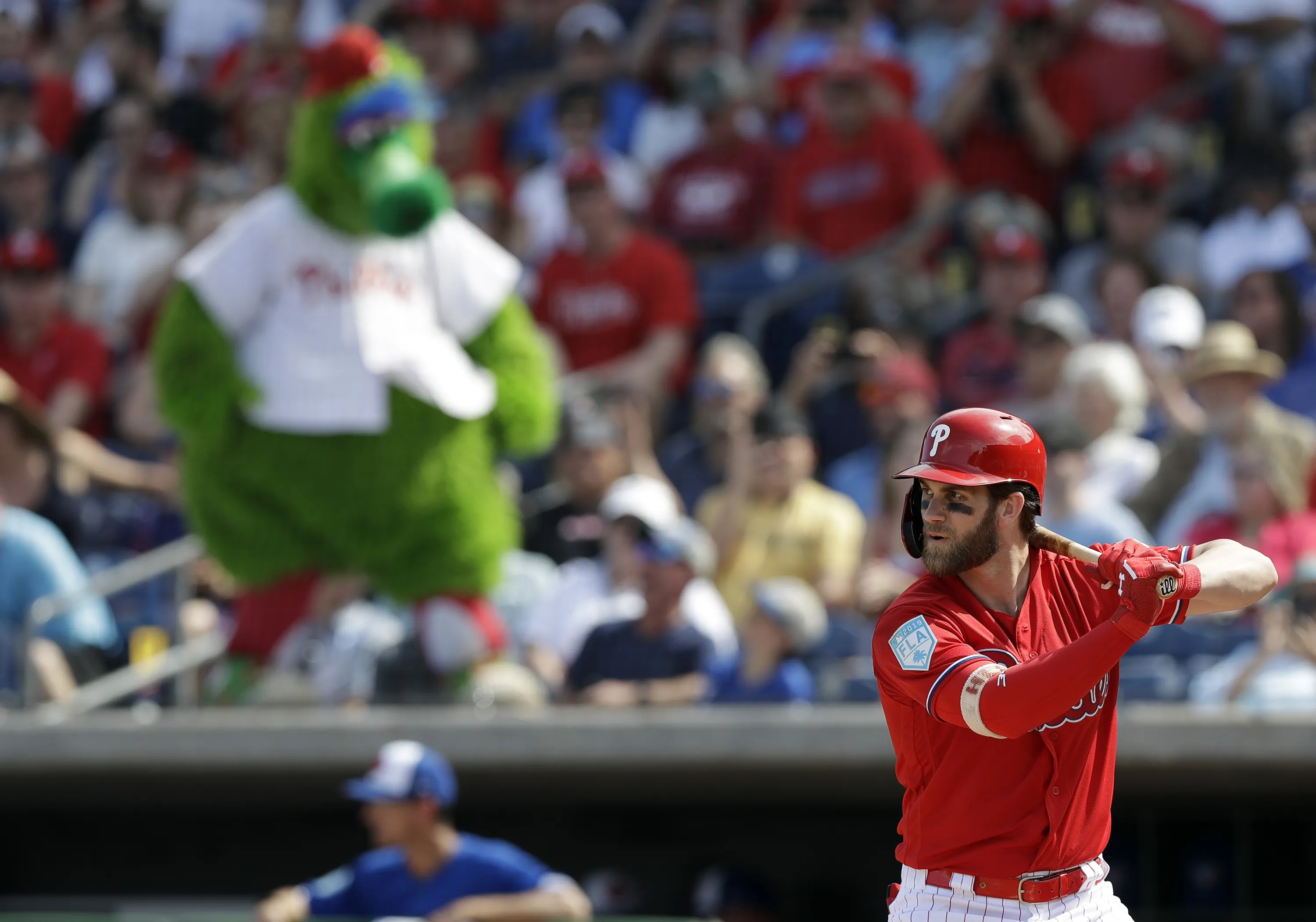 Philadelphia Phillies' Bryce Harper bats against the Toronto Blue Jays during the third inning of a spring training baseball game Saturday, March 9, 2019, in Clearwater, Fla. ({hoto by Chris O'Meara/AP Photo)