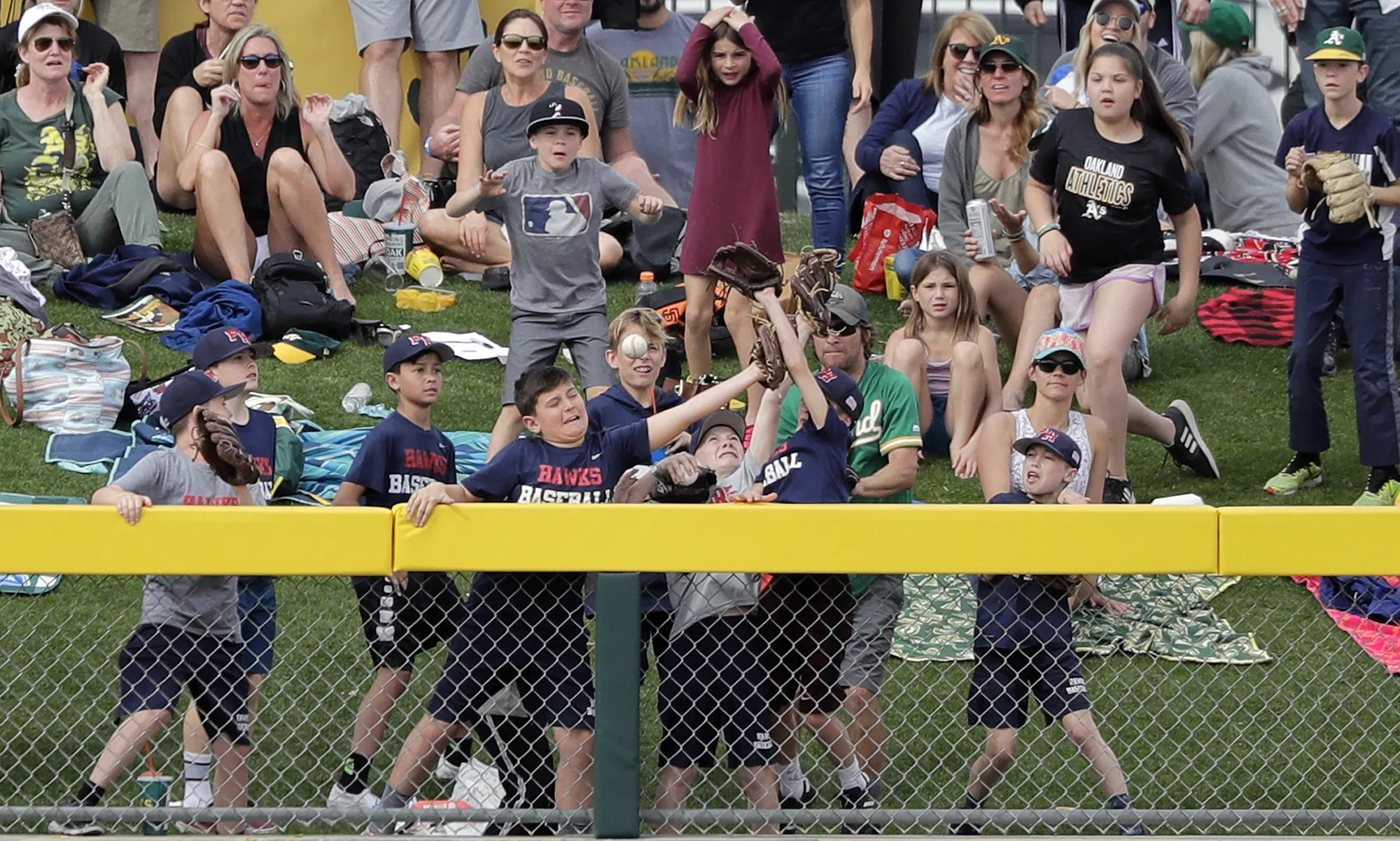 Fans reach for but miss the home run ball of Milwaukee Brewers' Nate Orf in the sixth inning of a spring training baseball game against the Oakland Athletics, Saturday, March 9, 2019, in Mesa, Ariz. (Photo by Elaine Thompson/AP Photo)