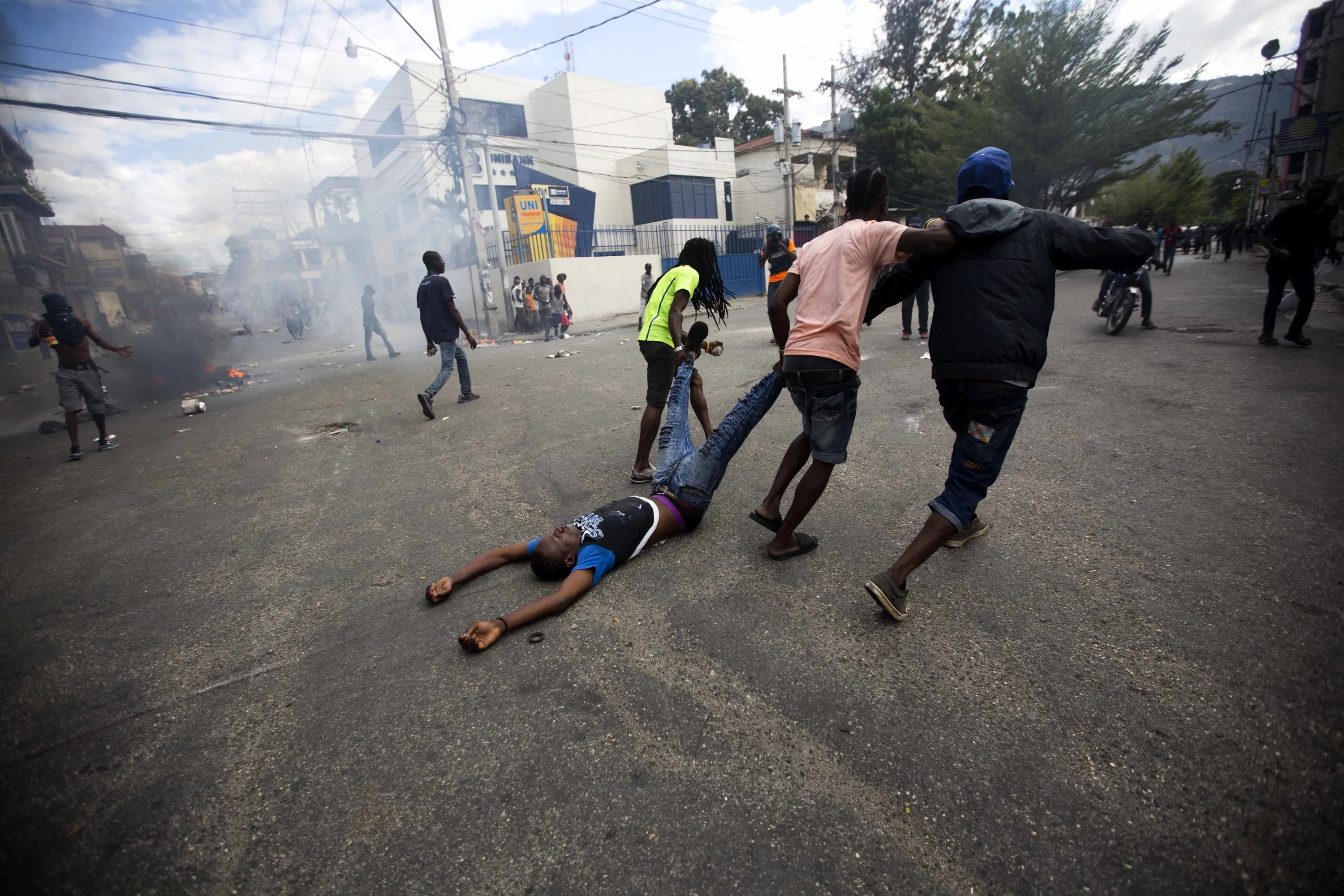 Demonstrators drag the body of a fellow protester toward police, as a form of protest after police shot into the crowd in which he died, during a demonstration demanding the resignation of Haitian President Jovenel Moise near the presidential palace in Port-au-Prince, Haiti, Tuesday, February 12, 2019. Protesters are angry about skyrocketing inflation and the government's failure to prosecute embezzlement from a multi-billion Venezuelan program that sent discounted oil to Haiti. (Photo by Dieu Nalio Chery/AP Photo)