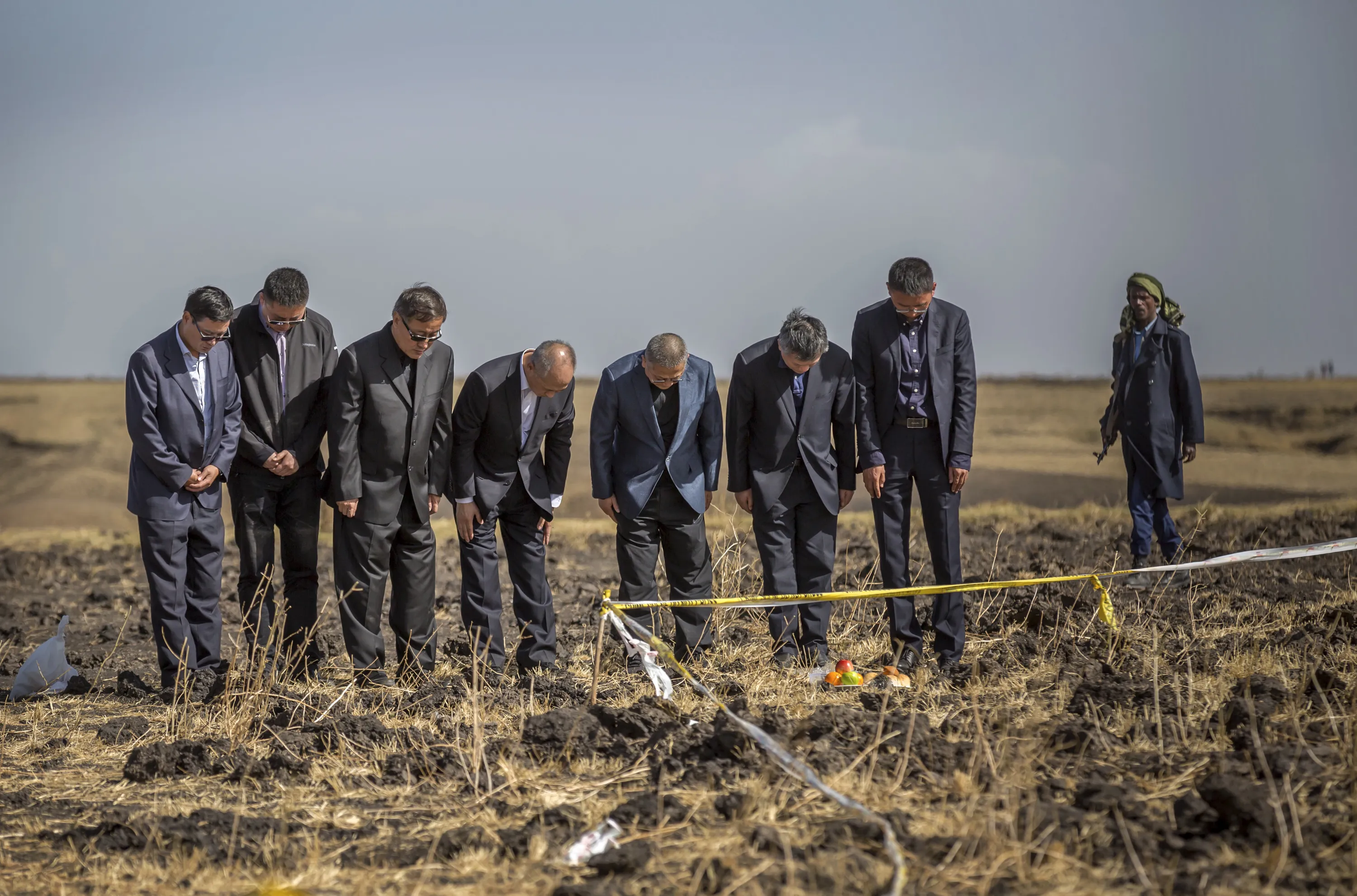 Officials from the Aviation Industry Corporation of China (AVIC) pray next to an offering of fruit, bread rolls, and a plastic container of Ethiopian Injera, a fermented sourdough flatbread, placed next to incense sticks, at the scene where the Ethiopian Airlines Boeing 737 Max 8 crashed shortly after takeoff on Sunday killing all 157 on board, near Bishoftu, or Debre Zeit, south of Addis Ababa, in Ethiopia Tuesday, March 12, 2019. Ethiopian Airlines had issued no new updates on the crash as of late afternoon Tuesday as families around the world waited for answers, while a global team of investigators began picking through the rural crash site. (Photo by Mulugeta Ayene/AP Photo)