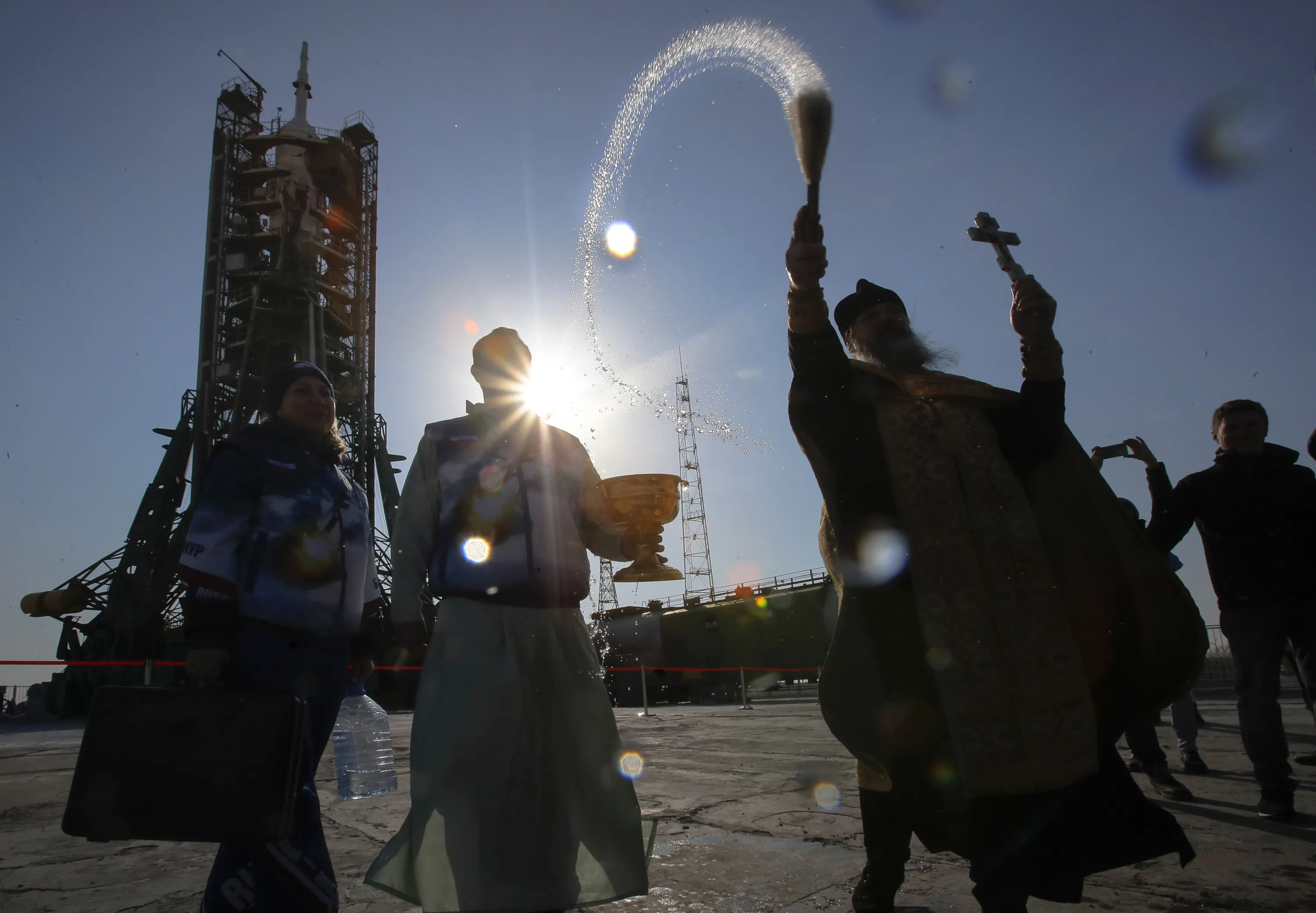 An Orthodox priest conducts a blessing service in front of the Soyuz FG rocket at the Russian leased Baikonur cosmodrome, Kazakhstan, Thursday, March 14, 2019. The new Soyuz mission to the International Space Station (ISS) is scheduled on Thursday, March 14 with U.S. astronauts Christina Hammock Koch, Nick Hague, and Russian cosmonaut Alexey Ovchinin. (Photo by Dmitri Lovetsky/AP Photo)