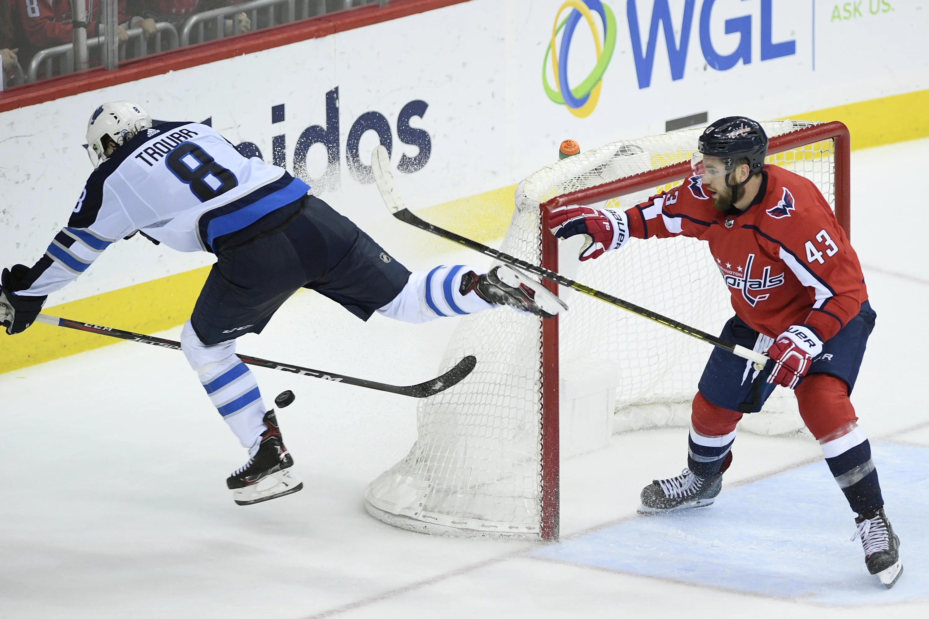 Winnipeg Jets defenseman Jacob Trouba (8) chases after the puck past Washington Capitals right wing Tom Wilson (43) during the third period of an NHL hockey game, Sunday, March 10, 2019, in Washington. The Capitals won 3-1. (Photo by Nick Wass/AP Photo)
