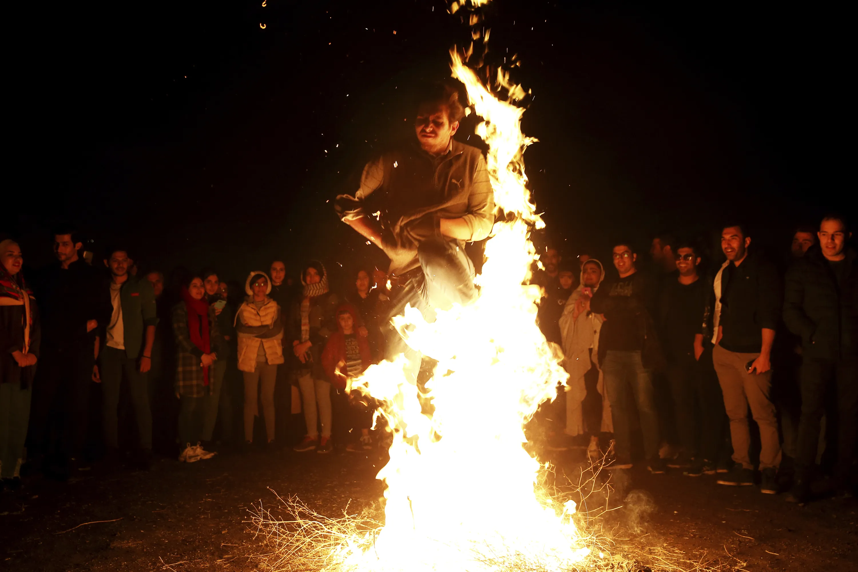 An Iranian man jumps over a bonfire during a celebration, known as “Chaharshanbe Souri”, or Wednesday Feast, marking the eve of the last Wednesday of the solar Persian year, Tuesday, March 19, 2019, in Tehran, Iran. (Photo by Ebrahim Noroozi/AP Photo)