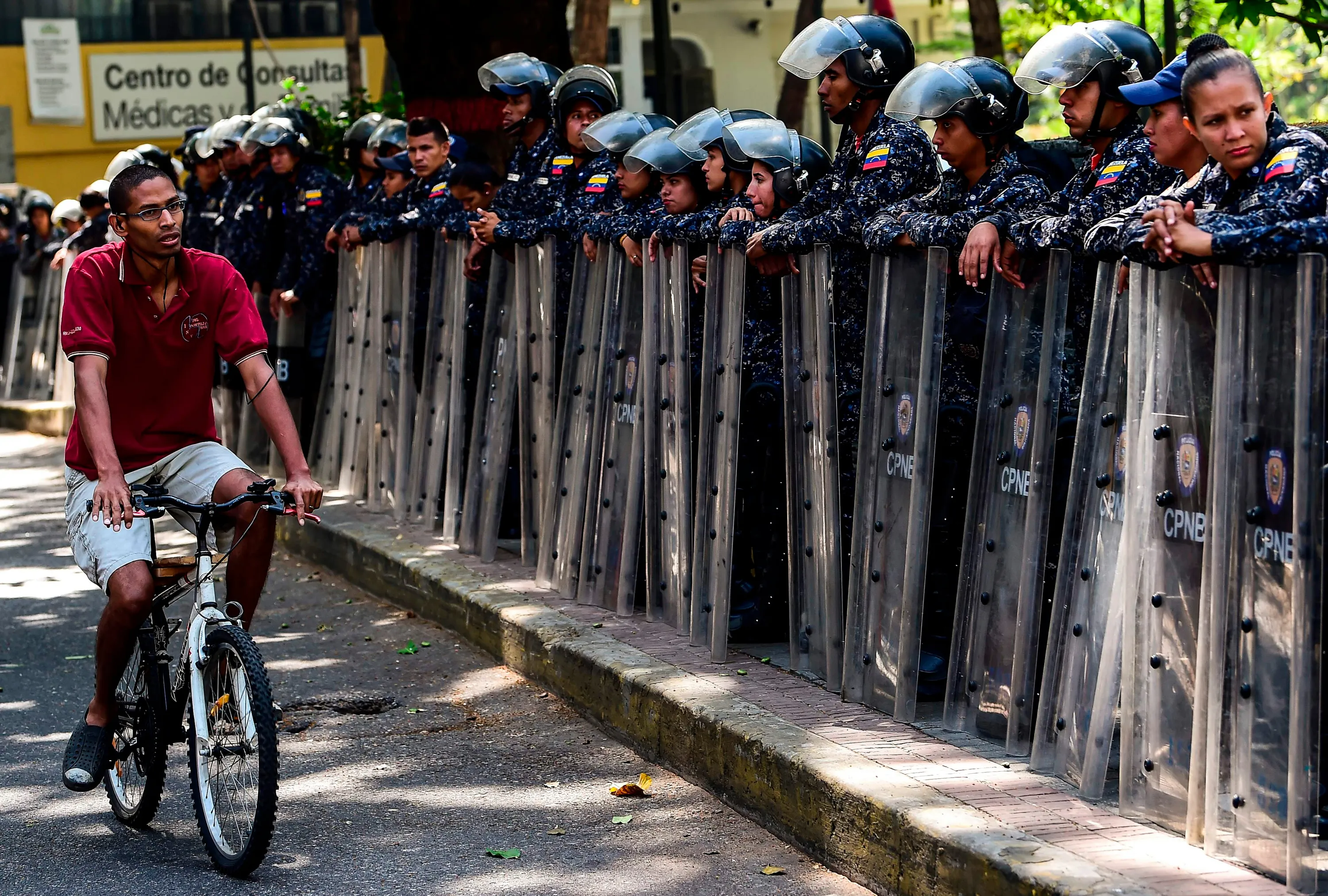 A man rides his bicycle as policemen stand on the sidewalk before a demonstration called by union leaders to demand labour protection against dismissals of civil servants in Caracas on March 19, 2019. The demonstration was finally called off due to the large deployment of security forces in the streets. (Photo by Ronaldo Schemidt/AFP Photo)
